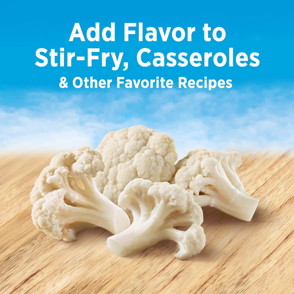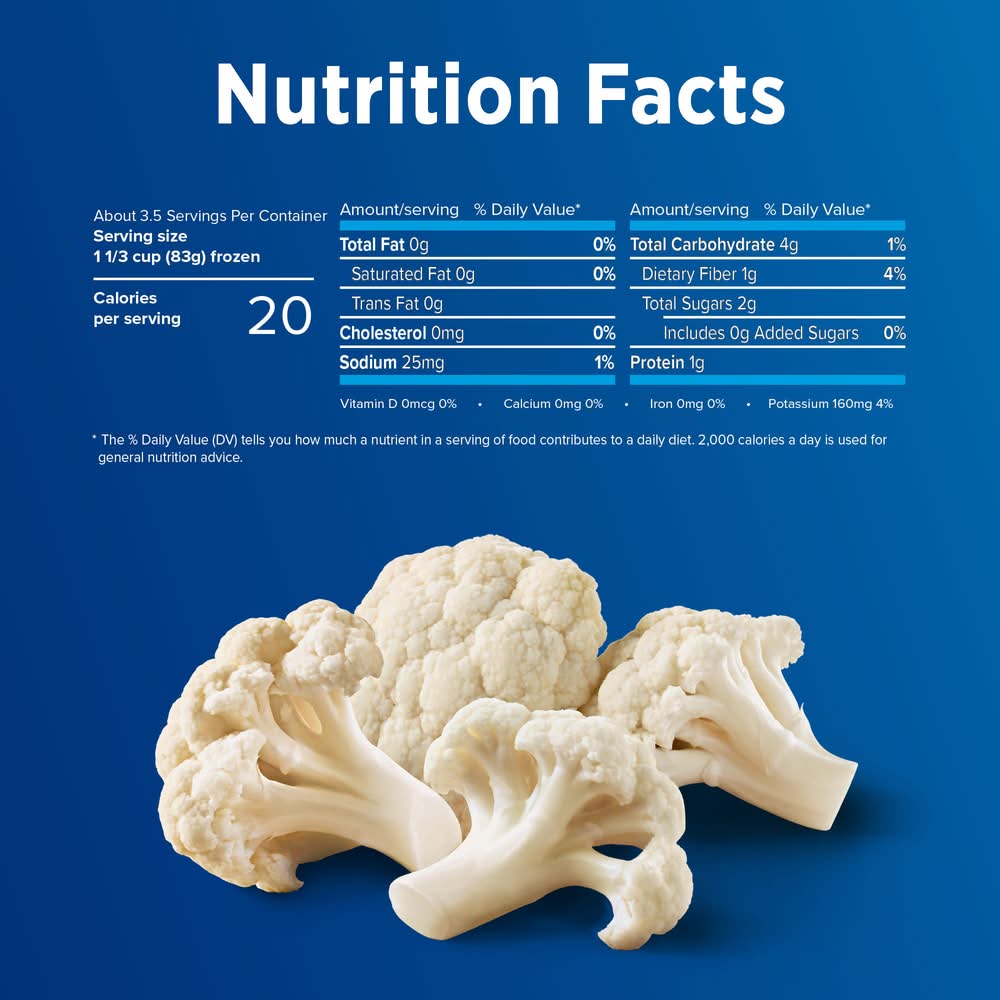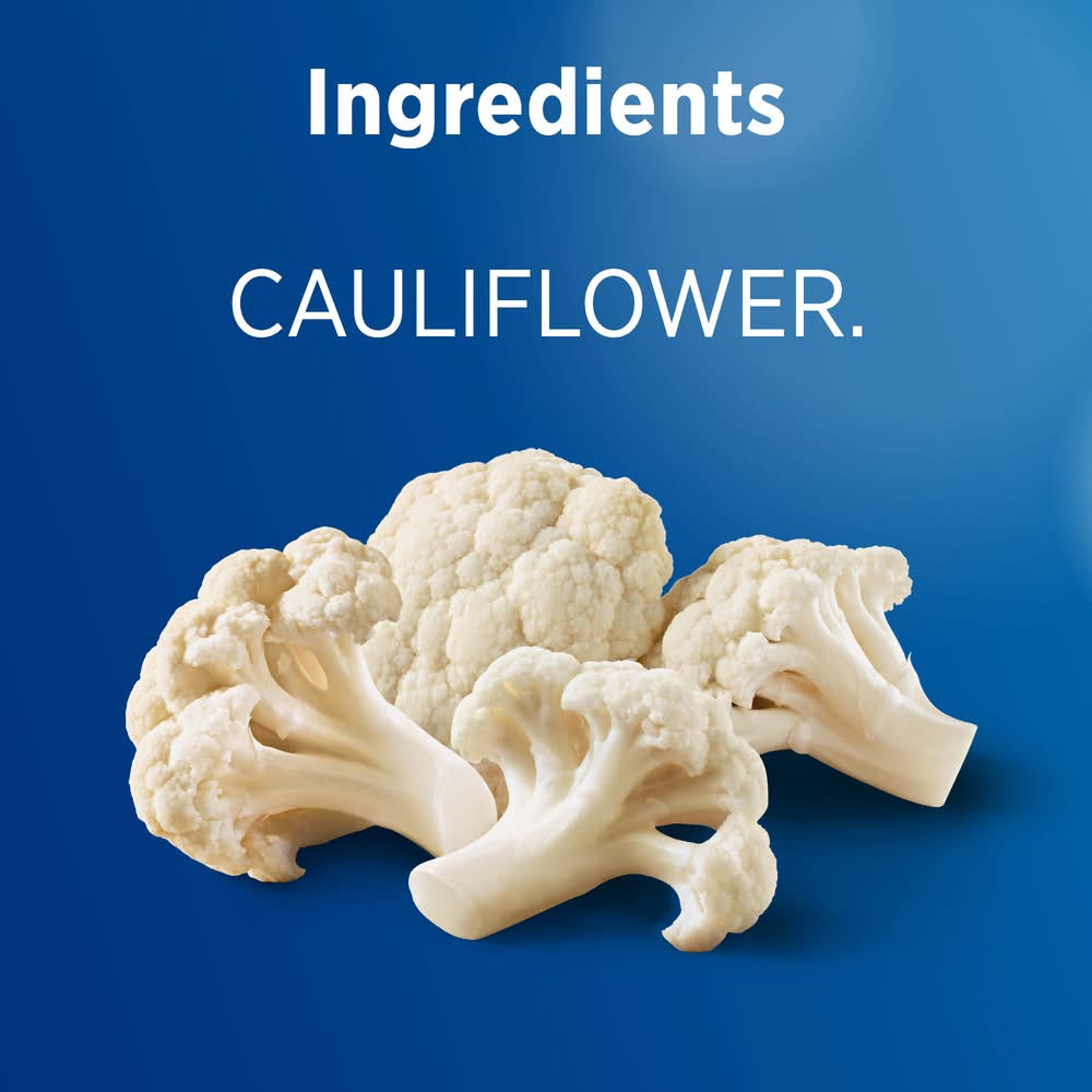Enjoy savory vegetables without the hassle when you have Birds Eye Cauliflower Florets. Cauliflower florets make it easy for everyone to love their vegetables. The cauliflower was specially selected and flash frozen, locking in fresh flavor and nutrients, to provide you and your family with high-quality frozen vegetables. This Birds Eye frozen cauliflower florets dish is made with no artificial flavors, colors or preservatives for a delicious and convenient way to enjoy frozen vegetable dishes and frozen sides without compromise. Serve the steamed vegetables as a side dish along with your favorite grilled meat, or add frozen veggies to grain bowls, pasta dishes and salads as part of a main dish. Easily prepare the frozen side dish by microwaving in the bag for up to 5 minutes or by cooking on the stovetop for 11 minutes. Let stand for 1 minute before serving. Store this 10.8 ounce bag of steamable frozen vegetables in the freezer to maintain freshness until you are ready to enjoy. It's good to eat vegetables, so Birds Eye makes vegetables good to eat. • Number of servings: 3 • Conagra, Chicago, IL, 60654
