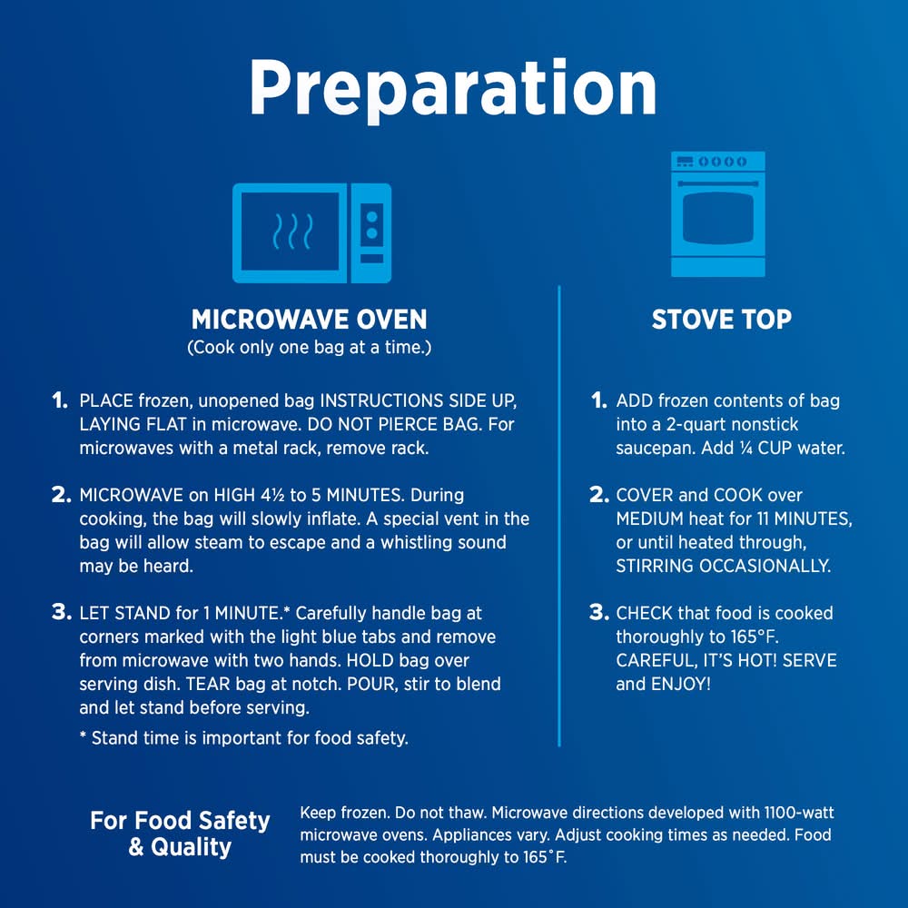Directions for use: Do not thaw - cook thoroughly. For Food Safety & Quality: Keep frozen. Do not thaw. Microwave directions developed with 1100-watt microwave ovens. Appliances vary. Adjust cooking times as needed. Food must be cooked thoroughly to 165 degrees F. Microwave Oven: Cook only one bag at a time. 1. Place frozen, unopened bag this side up, laying flat in microwave. Do not pierce bag. For microwaves with a metal rack, remove rack. 2. Microwave on high 4 1/2 to 5 minutes. During cooking, the bag will slowly inflate. A special vent in the bag will allow the steam to escape and a whistling sound may be heard. 3. Let stand for 1 minute (Stand time is important for food safety). Carefully handle bag at corners marked with the light blue tabs and remove from microwave with two hands. Hold bag over serving dish. Tear bag at notch. Pour, stir to blend and let stand before serving. Stove Top Instructions: 1. Empty frozen contents of bag into a 2-quart nonstick saucepan. Add 1/4 cup water. 2. Cover and cook over medium heat for 11 minutes, stirring occasionally. 3. Check that food is cooked thoroughly to 165 degrees F. Careful, it's hot! Serve and enjoy! Keep frozen. Storage recommendation: Keep frozen.