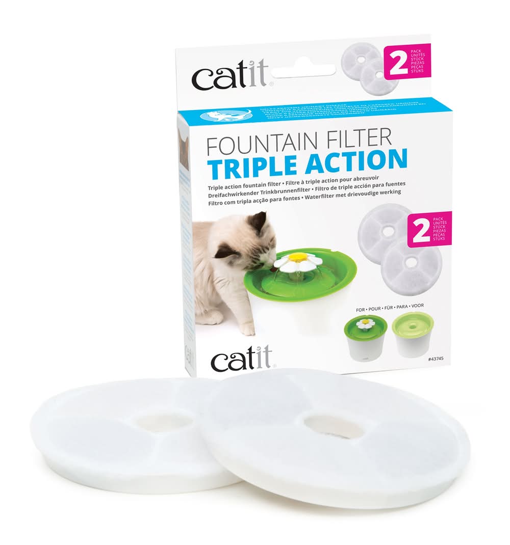 The Catit Triple Action filter removes magnesium and calcium from tap water|These minerals can accumulate in your pet’s lower urinary tract and lead to urinary tract diseases, which is a common health issue for cats|Active Carbon removes odors and impurities and retains stray hairs, sediment and debris|Guaranteed to safely and optimally purify your cat’s drinking water for approximately 30 days|Replace your Catit Triple Action Filter every month, or sooner, if the filter is visibly saturated