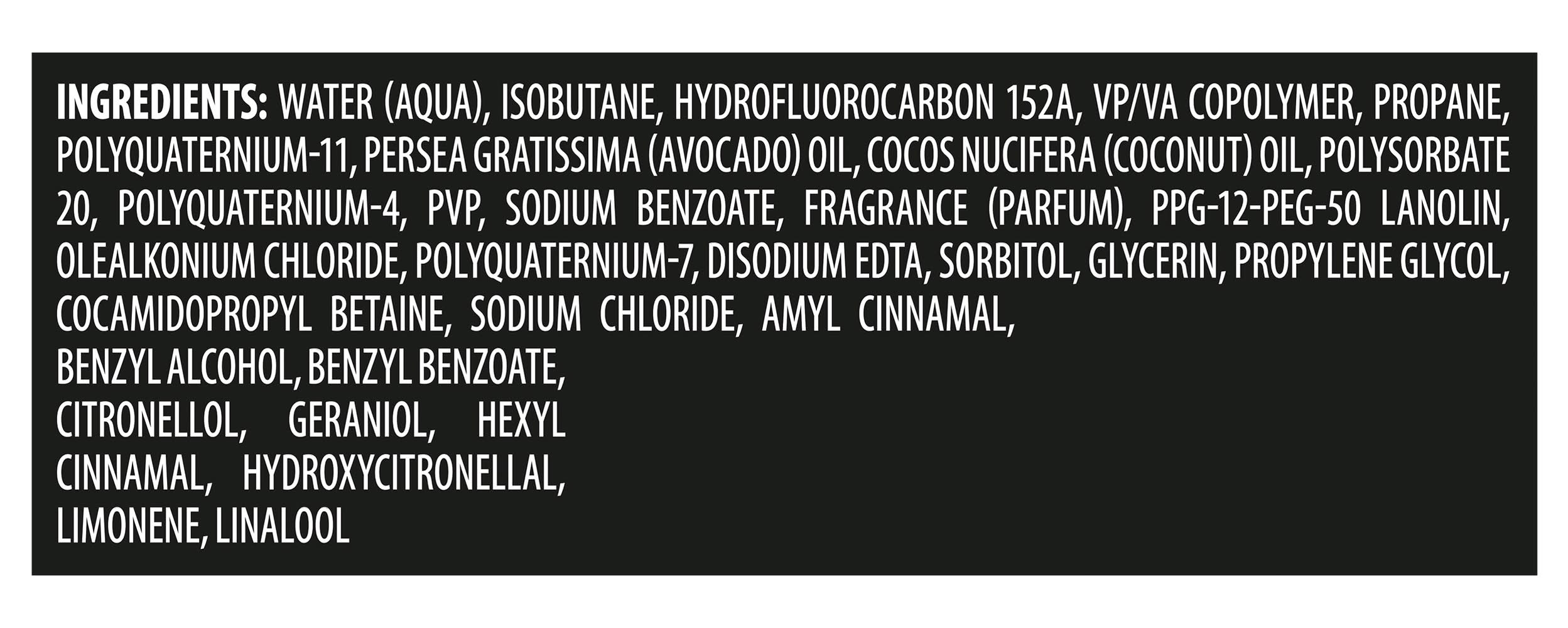 Ingredients: WATER (AWUA), ISOBUTANE, HYDROFLUOROCARBON 152A, VP/VA COPOLYMER, PROPANE, POLYQUATERNIUM-11, POLYSORBATE 20, POLYQUATERNIUM-4, PVP, FRAGRANCE (PARFUM), PPG-12-PEG-50 LANOLIN, OLEALKONIUM CHLORIDE, POLYQUATERNIUM-7, SODIUM BENZOATE, PROPYLENE GLYCOL, CYCLOPENTASILOXANE, SORBITOL, GLYCERIN, COCAMIDOPROPYL BETAINE, CYCLOHEXASILOXANE Contains: Tree Nuts