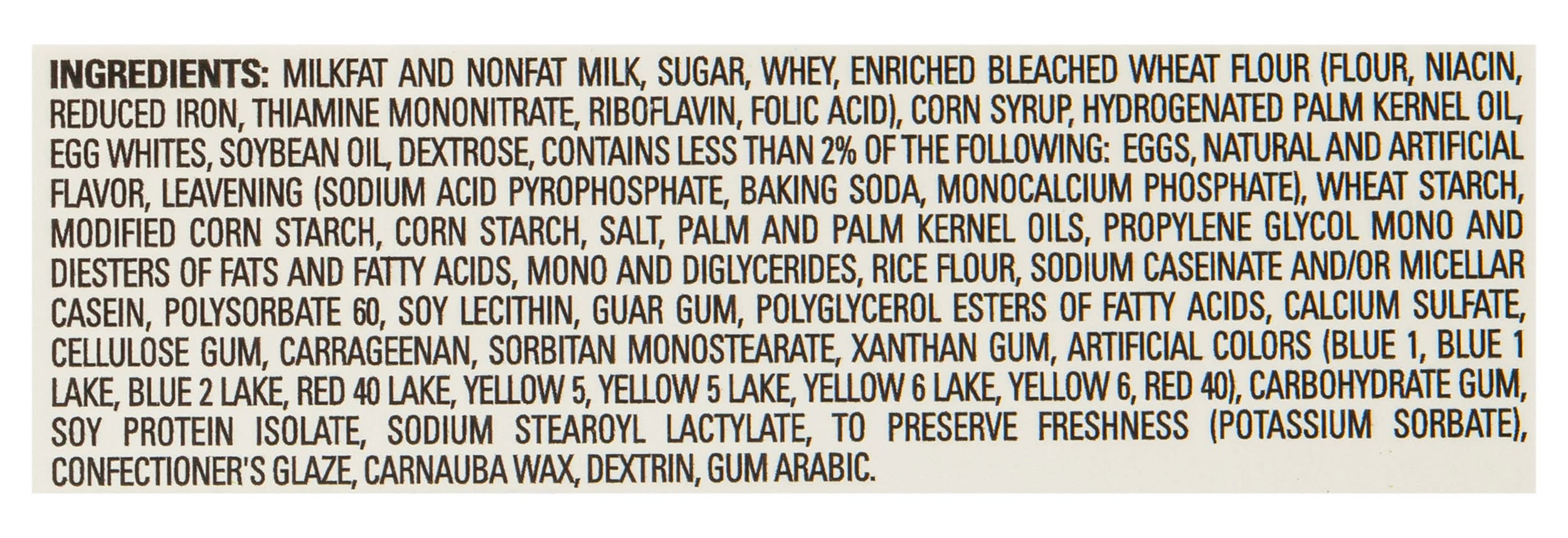 Ingredients: Milkfat and Nonfat Milk, Sugar, Whey, Enriched Bleached Wheat Flour (Flour, Niacin, Reduced Iron, Thiamine Mononitrate, Riboflavin, Folic Acid), Corn Syrup, Hydrogenated Palm Kernel Oil, Egg Whites, Soybean Oil, Dextrose, Contains Less than 2% of the Following: Eggs, Natural and Artificial Flavor, Leavening (Sodium Acid Pyrophosphate, Baking Soda, Monocalcium Phosphate), Wheat Starch, Modified Corn Starch, Corn Starch, Salt, Palm and Palm Kernel Oils, Propylene Glycol Mono and Diesters of Fats and Fatty Acids, Mono and Diglycerides, Rice Flour, Sodium Caseinate and/or Micellar Casein, Polysorbate 60, Soy Lecithin, Guar Gum, Polyglycerol Esters of Fatty Acids, Calcium Sulfate, Cellulose Gum, Carrageenan, Sorbitan Monostearate, Xanthan Gum, Artificial Colors (Blue 1, Blue 1 Lake, Blue 2 Lake, Red 40 Lake, Yellow 5, Yellow 5 Lake, Yellow 6 Lake, Yellow 6, Red 40), Carbohydrate Gum, Soy Protein Isolate, Sodium Stearoyl Lactylate, to Preserve Freshness (Potassium Sorbate), Confectioner's Glaze, Carnauba Wax, Dextrin, Gum Arabic Contains: Eggs, Milk, Soybeans, Wheat, Peanuts, Tree Nuts