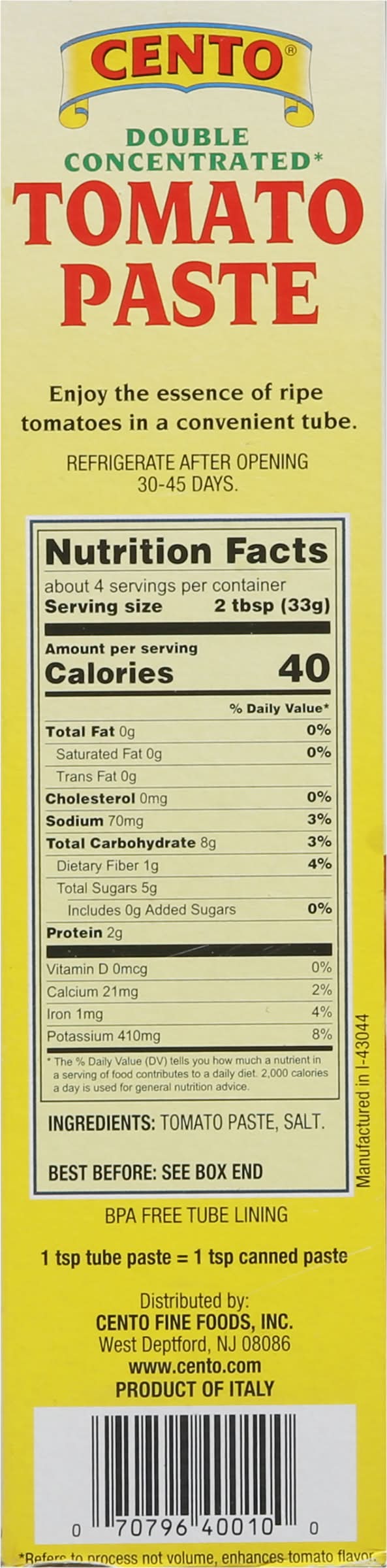 Cento Tomato Paste Tube 4.6 oz Cento fine foods, West Deptford, NJ 08086