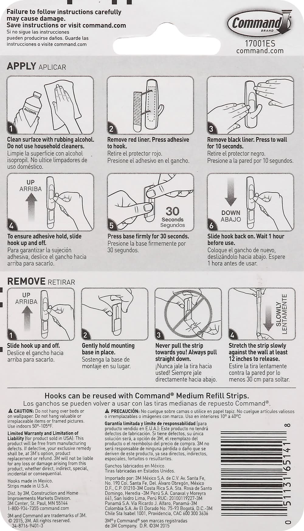 Holds. 3 lb (1.3 kg). Damage-free hanging. Holds strongly. Removes cleanly. Limited Warranty and Limitation of Liability (for product sold in USA): This product will be free from manufacturing defects. If defective, your exclusive remedy shall be, at 3M's option, product replace or refund. 3M will not be liable for any loss or damage arising from this product, whether direct, indirect, special, incidental or consequential. command.com. Hooks can be reused with Command Medium Refill Strips. Hooks made in Mexico. Strips made in USA. • Size: Medium • 3M, 3M Center, St. Paul, MN, 55144.