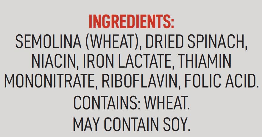 Semolina Wheat, Dried Spinach, Niacin, Iron Lactate, Thiamin Mononitrate, Riboflavin, Folic Acid Contains: Contains Wheat. May Contain Soy.