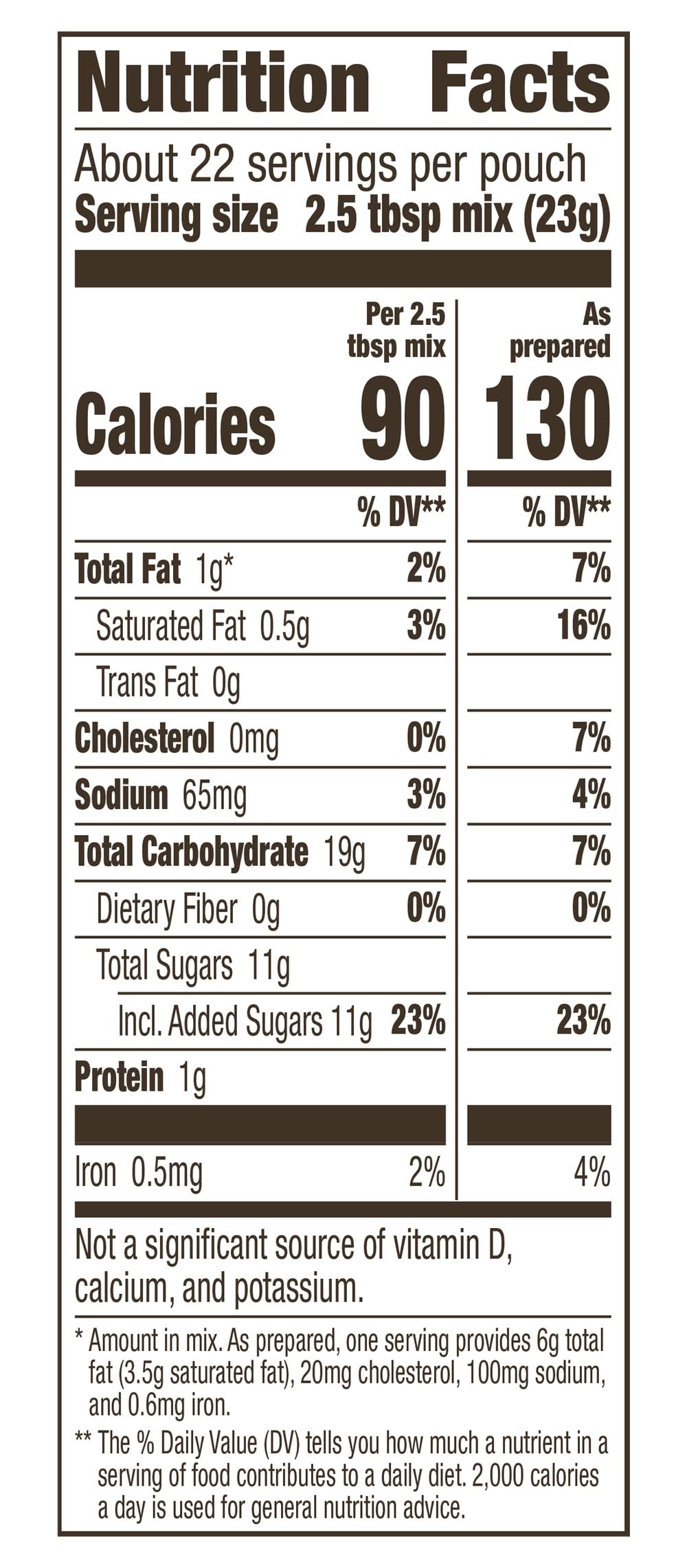 Per 2.5 Tbsp Mix as Packaged: 90 calories; 0.5 g sat fat (3% DV); 65 mg sodium (3% DV); 11 g total sugars. See nutrition fact for as prepared information. Ingredients derived from a bioengineered source. The Red Spoon Promise: The Red Spoon is my promise of great taste, quality and convenience. This is a product you and your family will enjoy. • Size: 17.5 OZ • General Mills Sales, Inc., Minneapolis, MN, 55440