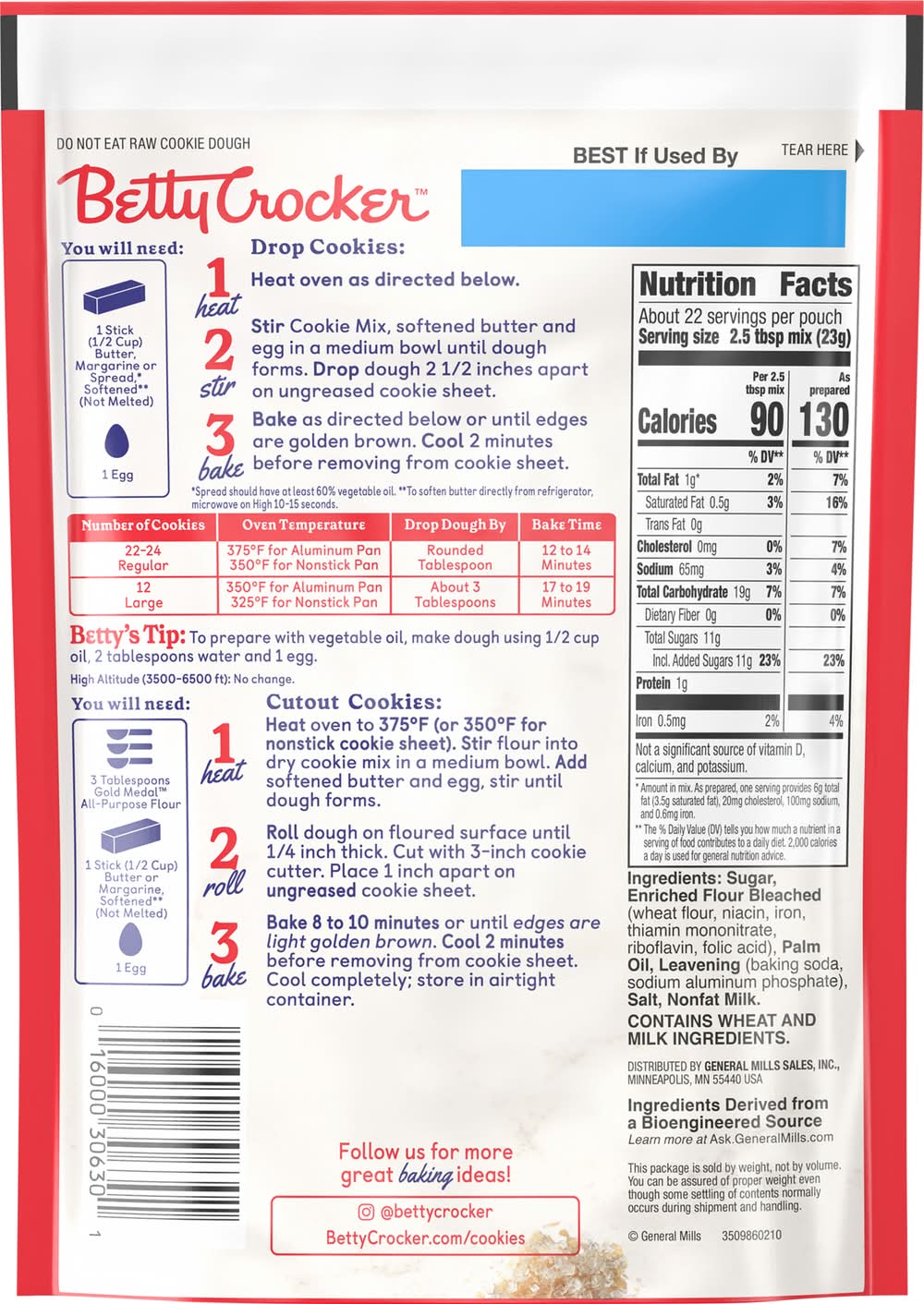 Directions: not eat raw cookie dough. you will need: for drop cookies: 1 stick (1/2 cup) butter, margarine or spread (spread should have at least 65% vegetable oil), softened (not melted): for cutout cookies: 3 tablespoons gold medal all-purpose flour + 1 stick (1/2 cup) butter, margarine, (spread should have at least 65% vegetable oil) melted. time to bake! drop cookies: 1. heat oven to 375 degrees f (or 350 degrees f for dark or nonstick cookie sheet). stir cookie mix, softened butter and egg in a medium bowl until soft dough forms. 2. drop: drop dough by rounded teaspoonfuls 2 inches apart on ungreased cookie sheet. for 2 dozen larger cookies, drop dough by tablespoonfuls. 3. bake: bake 7 to 9 (for larger cookies, 8 to 10 minutes) or until edges are light golden brown. cool 1 minute before removing from cookie sheet. cool completely; store in airtight container. cutout cookies: 1. heat: heat oven to 375 degrees f (or 350 degrees f for dark or nonstick cookie sheet). stir flour into dry cookie mix in a medium bowl. add melted butter and egg, stir until soft dough forms. 2. roll: roll dough on floured surface until 1/4 inch thick. cut with 2-inch cookie cutter. place 1 inch apart on ungreased cookie sheet. 3. bake: bake 5 to 7 minutes or until edges are light golden brown. cool 2 minutes before removing from cookie sheet. cool completely, store in airtight container. makes: 3 dozen 2 inch cookies. high altitude (3500 - 6500 ft): no change.