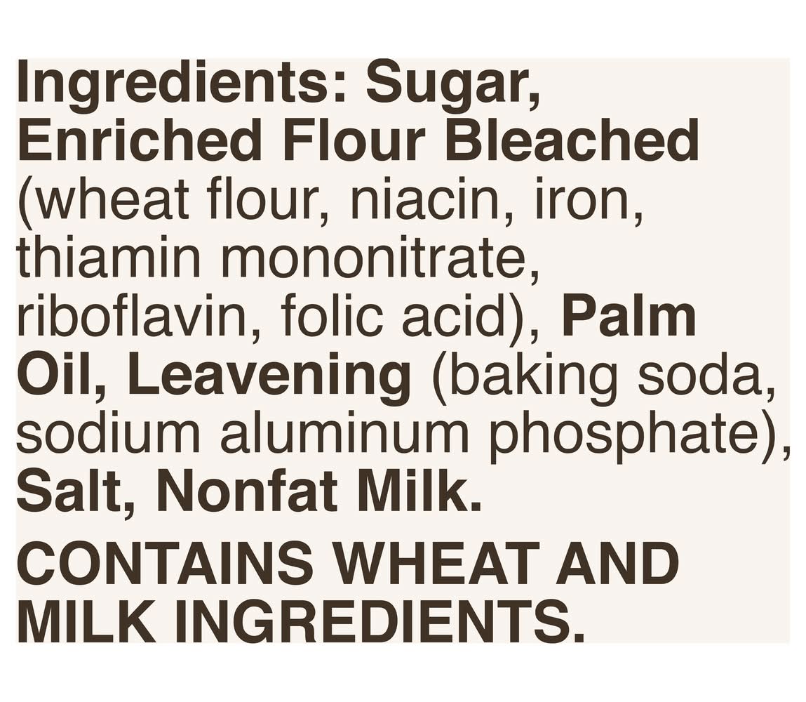 Ingredients: Sugar, Enriched Flour Bleached (Wheat Flour, Niacin, Iron, Thiamin Mononitrate, Riboflavin, Folic Acid), Palm Oil, Leavening (Baking Soda, Sodium Aluminum Phosphate), Salt, Nonfat Milk Contains: Wheat, Milk