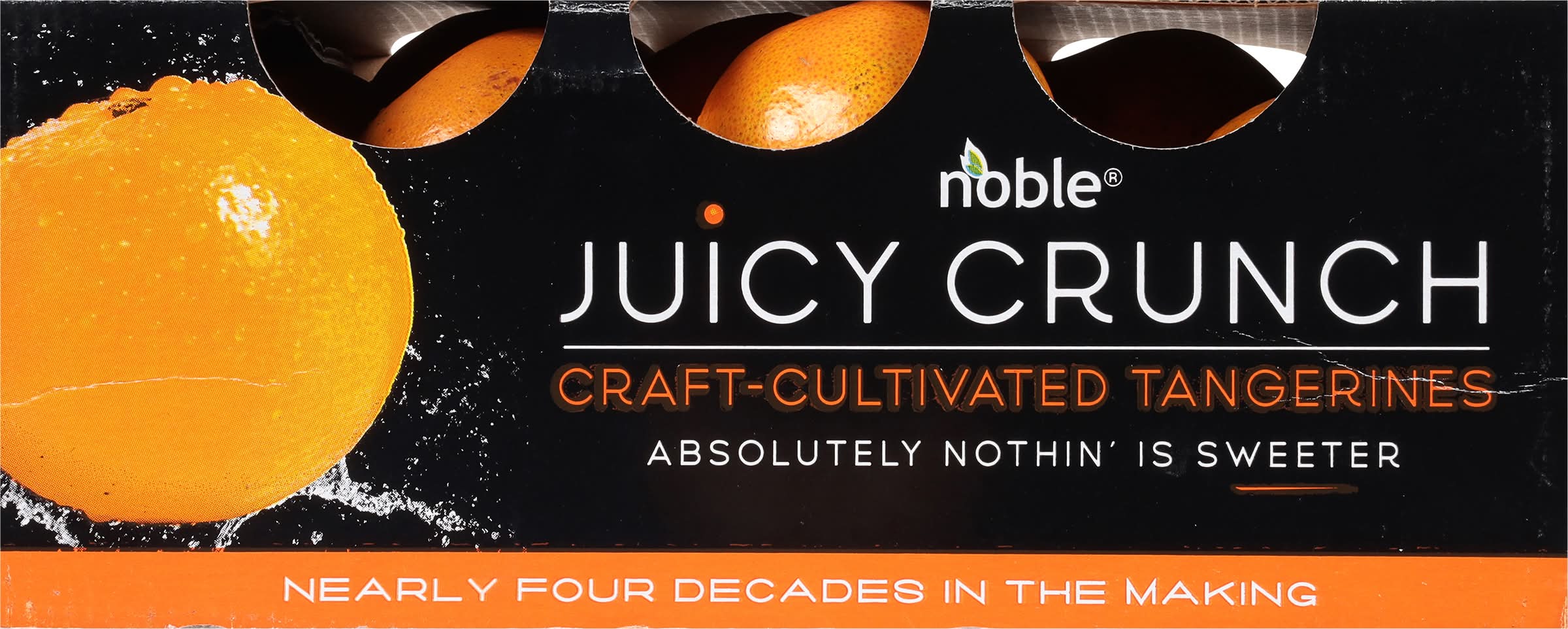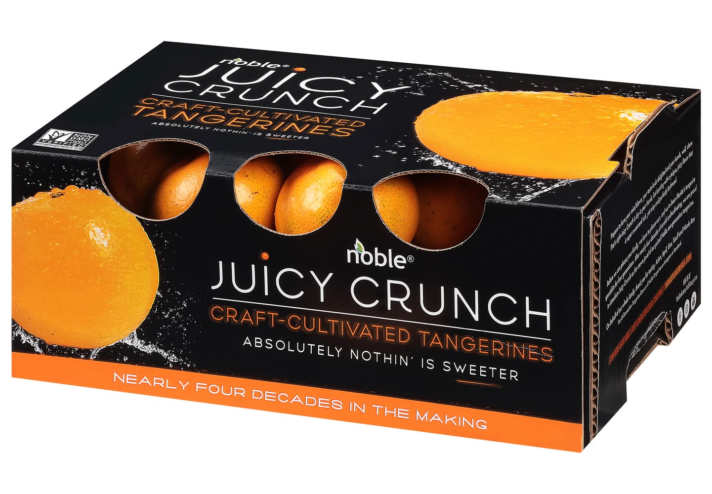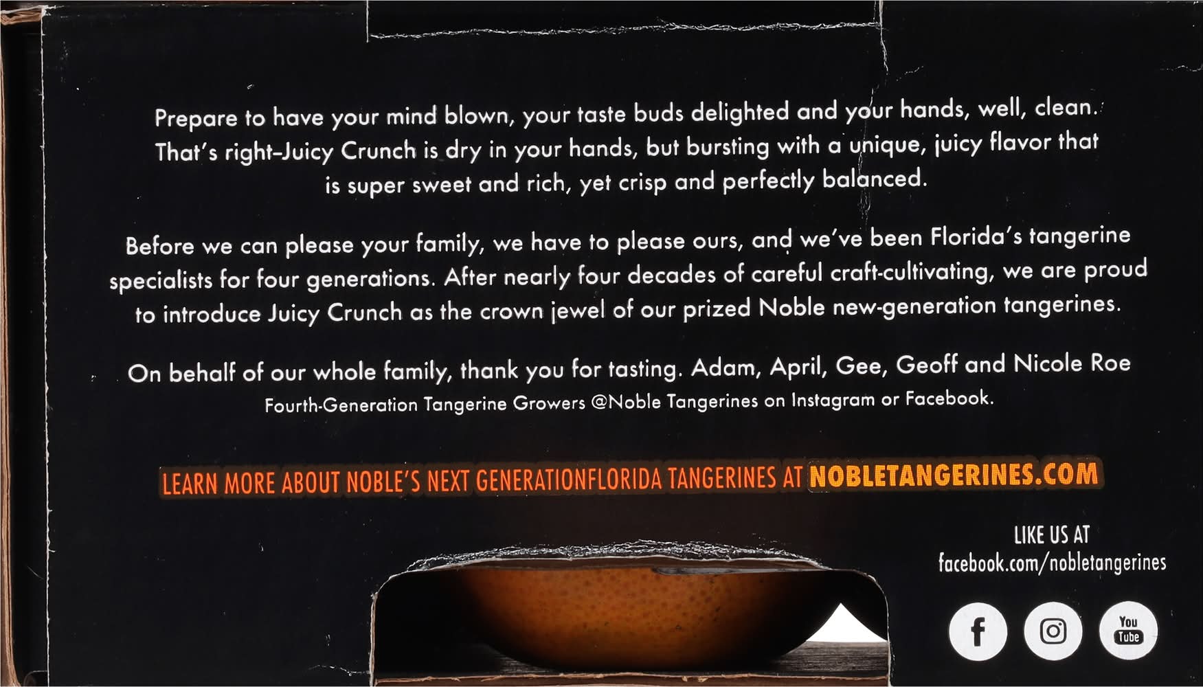 Non-GMO Project verified. nongmoproject.org. Absolutely nothin' is sweeter. Nearly four decades in the making. Fresh from Florida. Treated with the following fungicides: Sodium orthophenyl phenate, imazalil and or thiabendazole. Coated with carnauba wax or resin to maintain freshness. US no.1. This shipment of citrus fruit is certified under applicable Federal domestic plant quarantines. Prepare to have your mind blown, your taste buds delighted and your hands, well, clean. That's right-juicy crunch is dry in your hands, but bursting with a unique, juicy flavor that is super sweet and rich, yet crisp and perfectly balanced. Before we can please your family, we have to please ours, and we've been Florida's tangerine specialists for four generations. After nearly four decades of careful craft-cultivating, we are proud to introduce juicy crunch as the crown jewel of our prized noble new-generation tangerines. On behalf of our whole family, thank you for tasting. Adam, April, Gee, Geoff and Nicole Roe. This corrugated fiberboard container has a bursting test of not less than 250 lbs. per sq. inch. Max-Pak. Lakeland, Florida. USDA-APHIS-PPQ-CHRP certificate. Nobletangerines.com. Fourth-generation tangerine growers (at)Noble Tangerines on Instagram or Facebook. Like us at facebook.com/nobletangerines. Facebook. Instagram. YouTube. Learn more about noble's next GenerationFlorida tangerines at nobletangerines.com. Product of USA. • Noble World Wide Global Citrus Sales, • Packaging: Reusable
