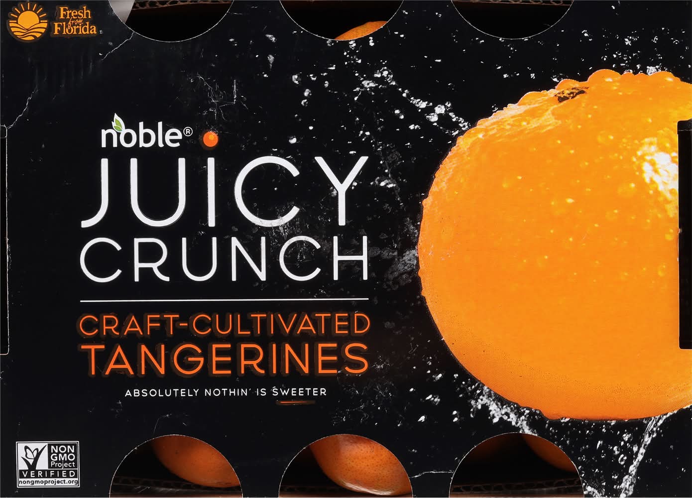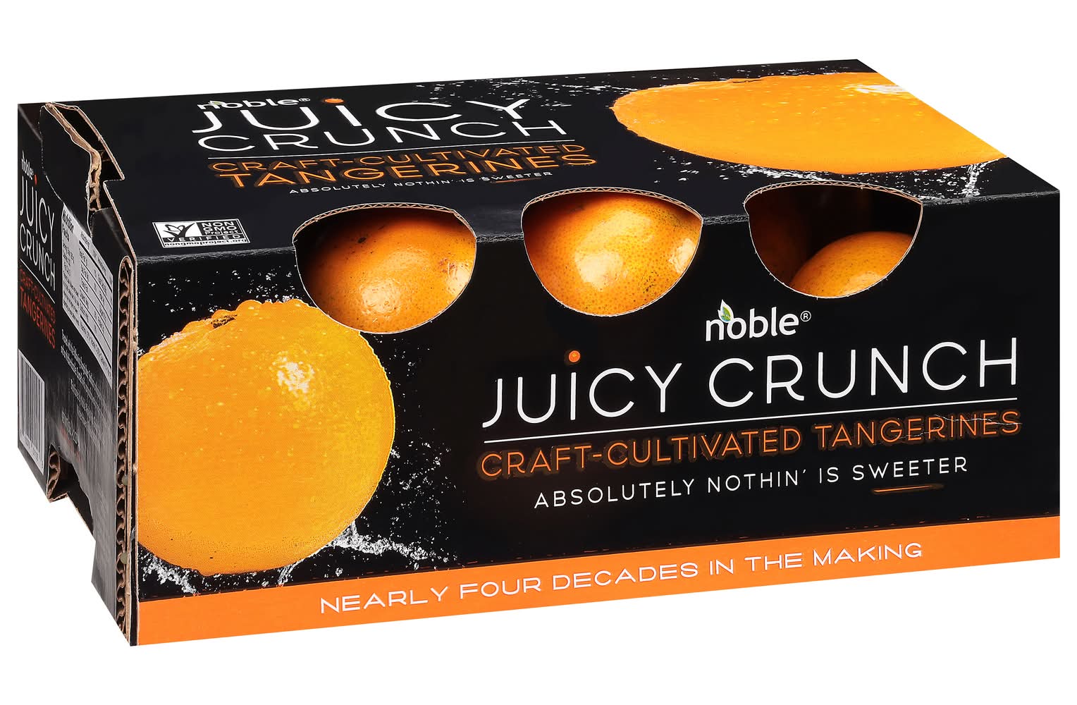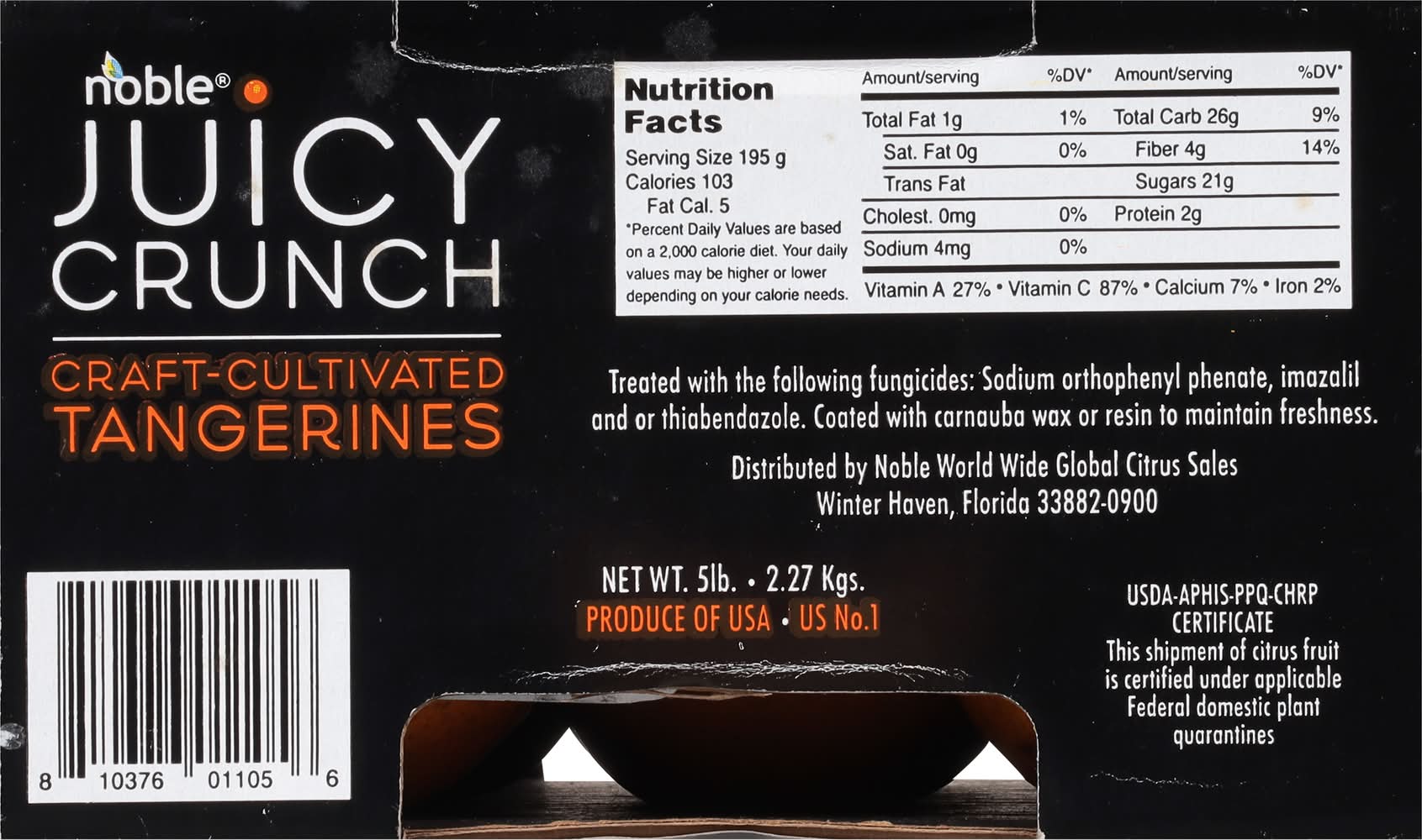 Non-GMO Project verified. nongmoproject.org. Absolutely nothin' is sweeter. Nearly four decades in the making. Fresh from Florida. Treated with the following fungicides: Sodium orthophenyl phenate, imazalil and or thiabendazole. Coated with carnauba wax or resin to maintain freshness. US no.1. This shipment of citrus fruit is certified under applicable Federal domestic plant quarantines. Prepare to have your mind blown, your taste buds delighted and your hands, well, clean. That's right-juicy crunch is dry in your hands, but bursting with a unique, juicy flavor that is super sweet and rich, yet crisp and perfectly balanced. Before we can please your family, we have to please ours, and we've been Florida's tangerine specialists for four generations. After nearly four decades of careful craft-cultivating, we are proud to introduce juicy crunch as the crown jewel of our prized noble new-generation tangerines. On behalf of our whole family, thank you for tasting. Adam, April, Gee, Geoff and Nicole Roe. This corrugated fiberboard container has a bursting test of not less than 250 lbs. per sq. inch. Max-Pak. Lakeland, Florida. USDA-APHIS-PPQ-CHRP certificate. Nobletangerines.com. Fourth-generation tangerine growers (at)Noble Tangerines on Instagram or Facebook. Like us at facebook.com/nobletangerines. Facebook. Instagram. YouTube. Learn more about noble's next GenerationFlorida tangerines at nobletangerines.com. Product of USA. • Noble World Wide Global Citrus Sales, • Packaging: Reusable