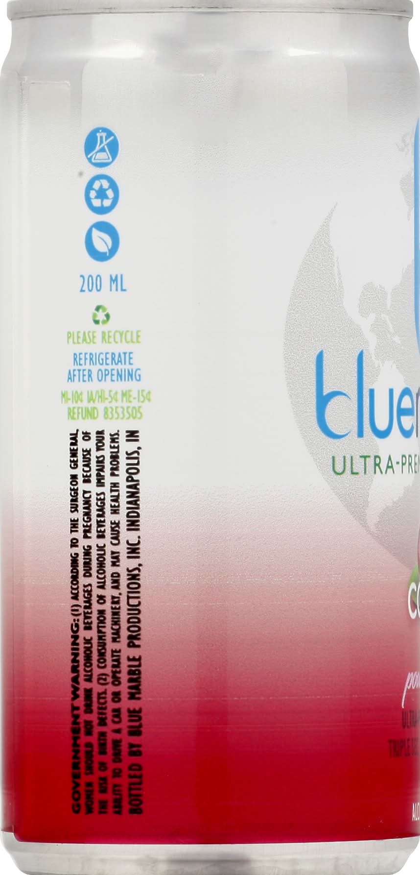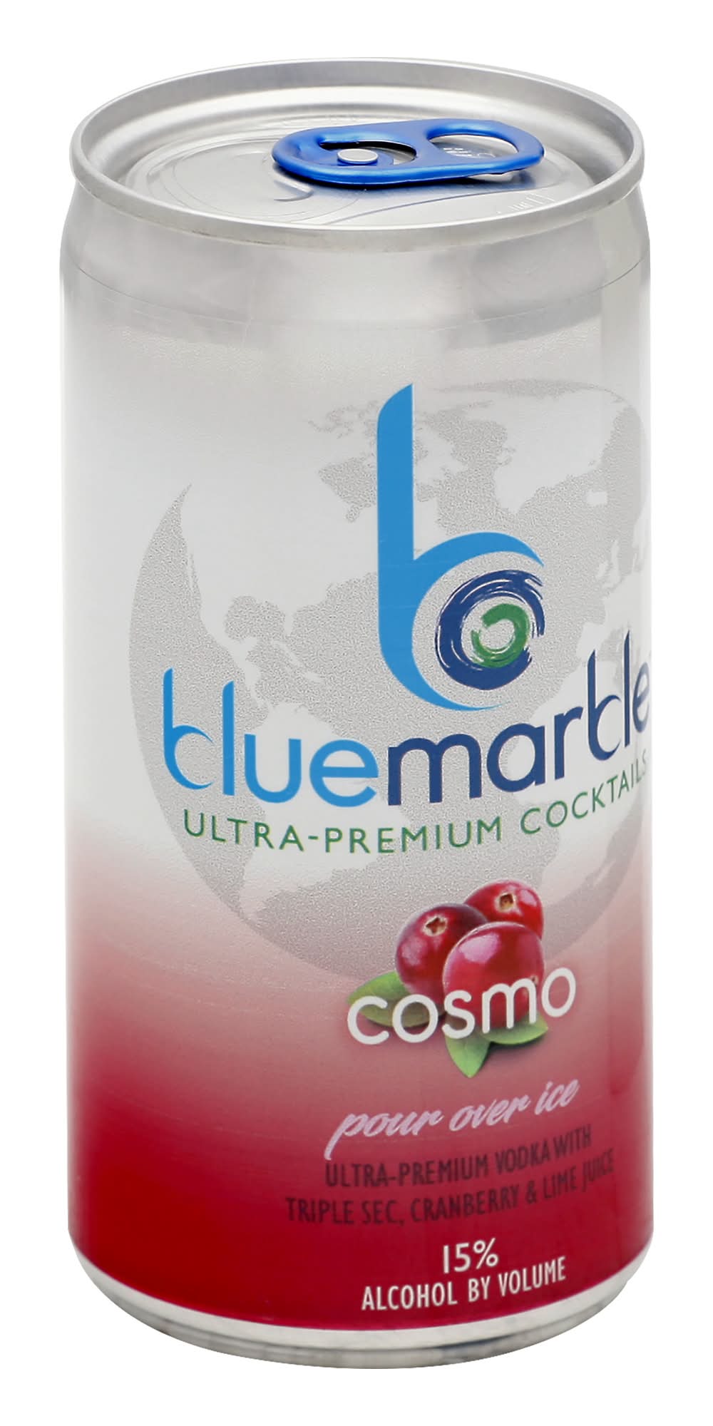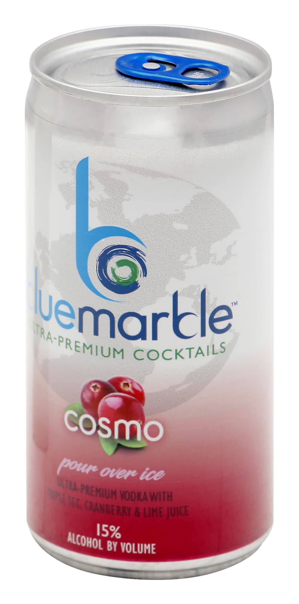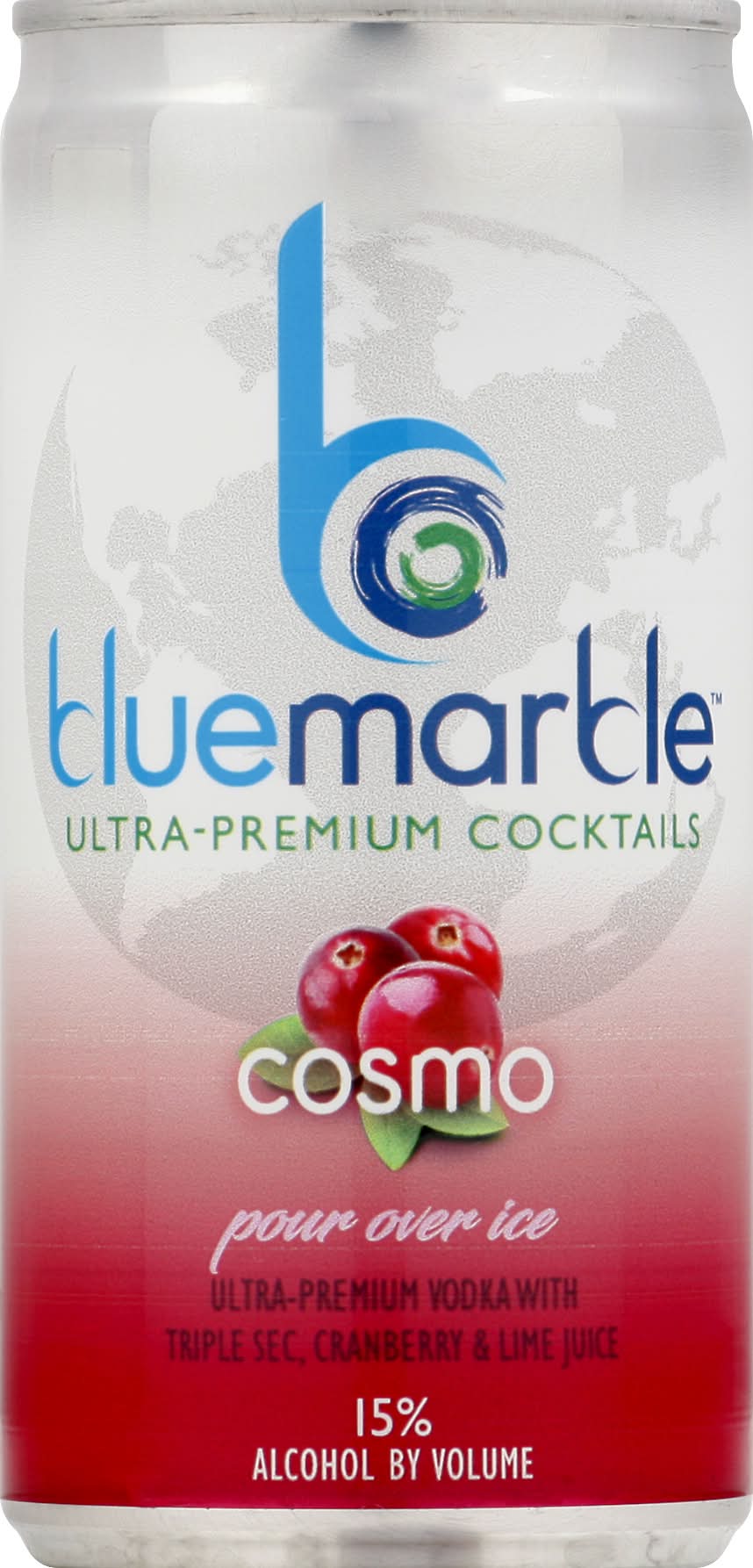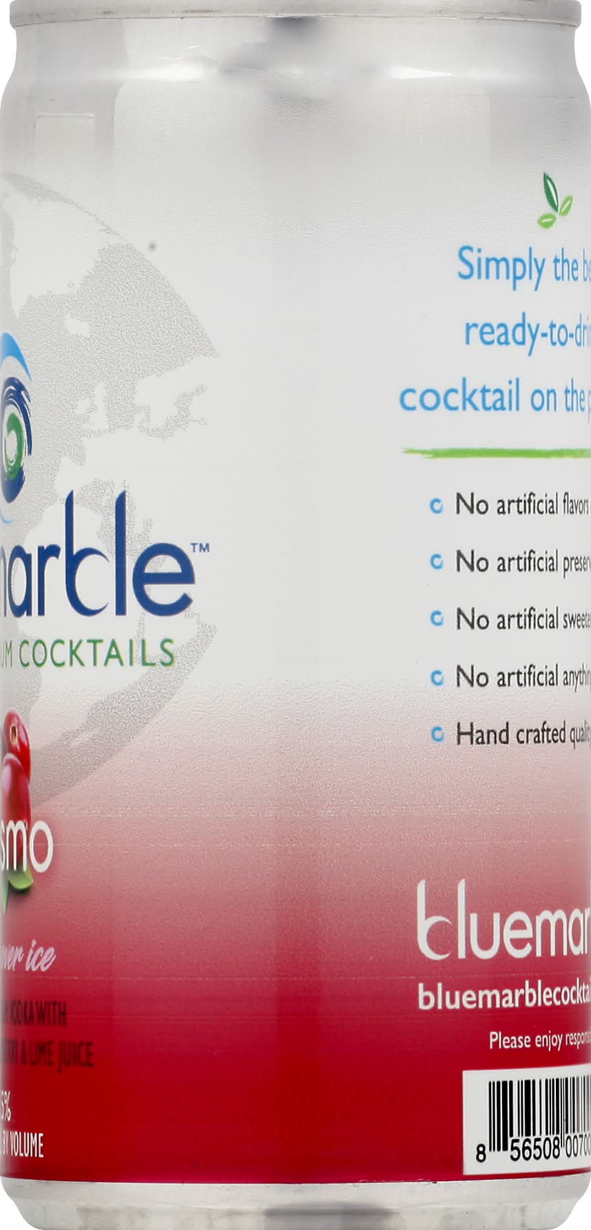 Ultra-premium vodka with triple sec, cranberry & lime juice. No artificial flavors or dyes. Simply the best ready-to-drink cocktail on the planet. No artificial preservatives. No artificial sweeteners. No artificial anything! Hand crafted quality. Please enjoy responsibly. bluemarblecocktails.com. Please recycle. 15% alcohol by volume. 30 • Alcohol by volume: 15% • Blue Marble Productions, • Packaging: Reusable