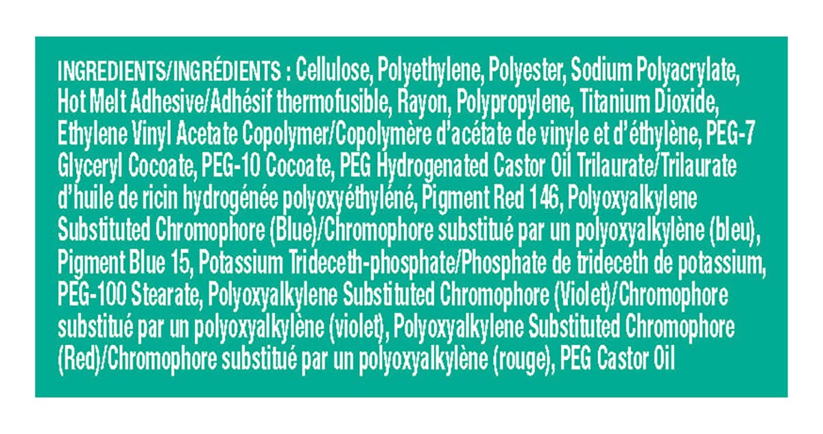 Ingredients: Cellulose, Polyethylene, Polyester, Sodium Polyacrylate, Hot Melt Adhesive/Adhesif Thermofusible, Rayon, Polypropylene, Titanium Dioxide, Ethylene Vinyl Acetate Copolymer/Copolymere D'acetate De Vinyle Et D'ethylene, PEG-7 Glyceryl Cocoate, PEG-10 Cocoate, PEG Hydrogenated Castor Oil Trilaurate/Trilaurate D'huile De Ricin Hydrogenee Polyoxyethylene, Pigment Red 146, Polyoxyalkylene Substituted Chromophore (Blue)/Chromophore Substitue Par Un Polyoxyalkylene (Bleu), Pigment Blue 15, Potassium Trideceth-Phosphate/Phosphate De Trideceth De Potassium, PEG-100 Stearate, Polyoxyalkylene Substituted Chromophore (Violet)/Chromophore Substitue Par Un Polyoxyalkylene (Violet), Polyoxyalkylene Substituted Chromophore (Red)/Chromophore Substitue Par Un Polyoxyalkylene (Rouge), PEG Castor Oil