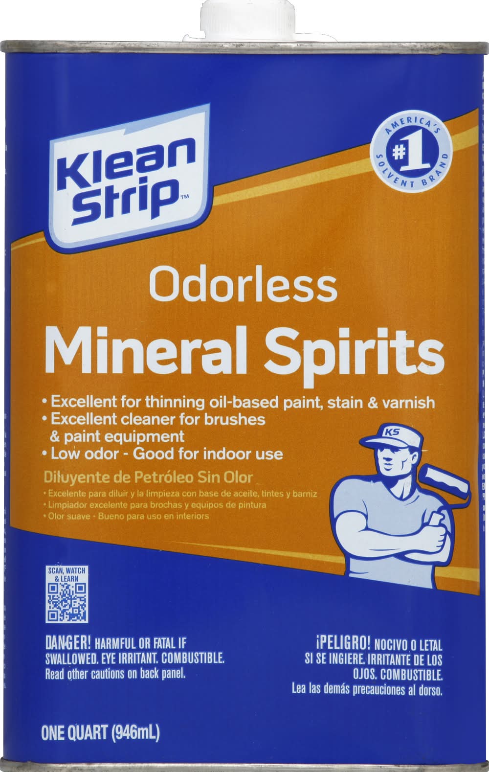 America's number 1 solvent brand. Excellent for thinning-oil based paint, stain & varnish. Excellent cleaner for brushes & paint equipment. Low odor - good for indoor use. Read other cautions on back panel. Klean-Strip Odorless Mineral Spirits is a premium, highly refined solvent formula which effectively thins and blends well into oil-based paint, stain and varnish. It is very low odor and dries with no residue and is an excellent cleaner for brushes and equipment. www.kleanstrip.com. For assistance: Call the Barr Help Line 1-800-398-3892 Monday through Friday 8 am to 4:30 pm CT. Wm Barr & Co,