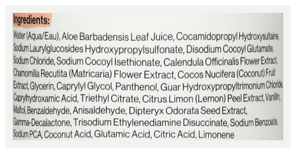 Water Aqua/Eau), Aloe Barbadensis Leaf Juice, Cocamidopropyl Hydroxysultaine, Sodium Laurylglucosides Hydroxypropylsulfonate, Disodium Cocoyl Glutamate, Sodium Chloride, Sodium Cocoyl Isethionate, Calendula Officinalis Flower Extract, Chamonilla Recutita (Matricaria) Flower Extract, Cocos Nucifera (Coconut) Fruit Extract, Glycerin, Caprylyl Glycol, Panthenol, Guar Hydroxypropyltrimonium Chloride, Capyhydroxamic Acid, Triethyl Citrate, Citrus Limon (Lemon) Peel Extract, Vanillin, Maltol Benzaldehyde, Anisaldehyde, Dipteryx Odorata Seed Extract, Gamma-Decalactone, Trisodium Ethylenediamine Disuccinate, Sodium Benzoate, Sodium PCA, Coconut Acid, Glutamic Acid, Citric Acid, Limonene
