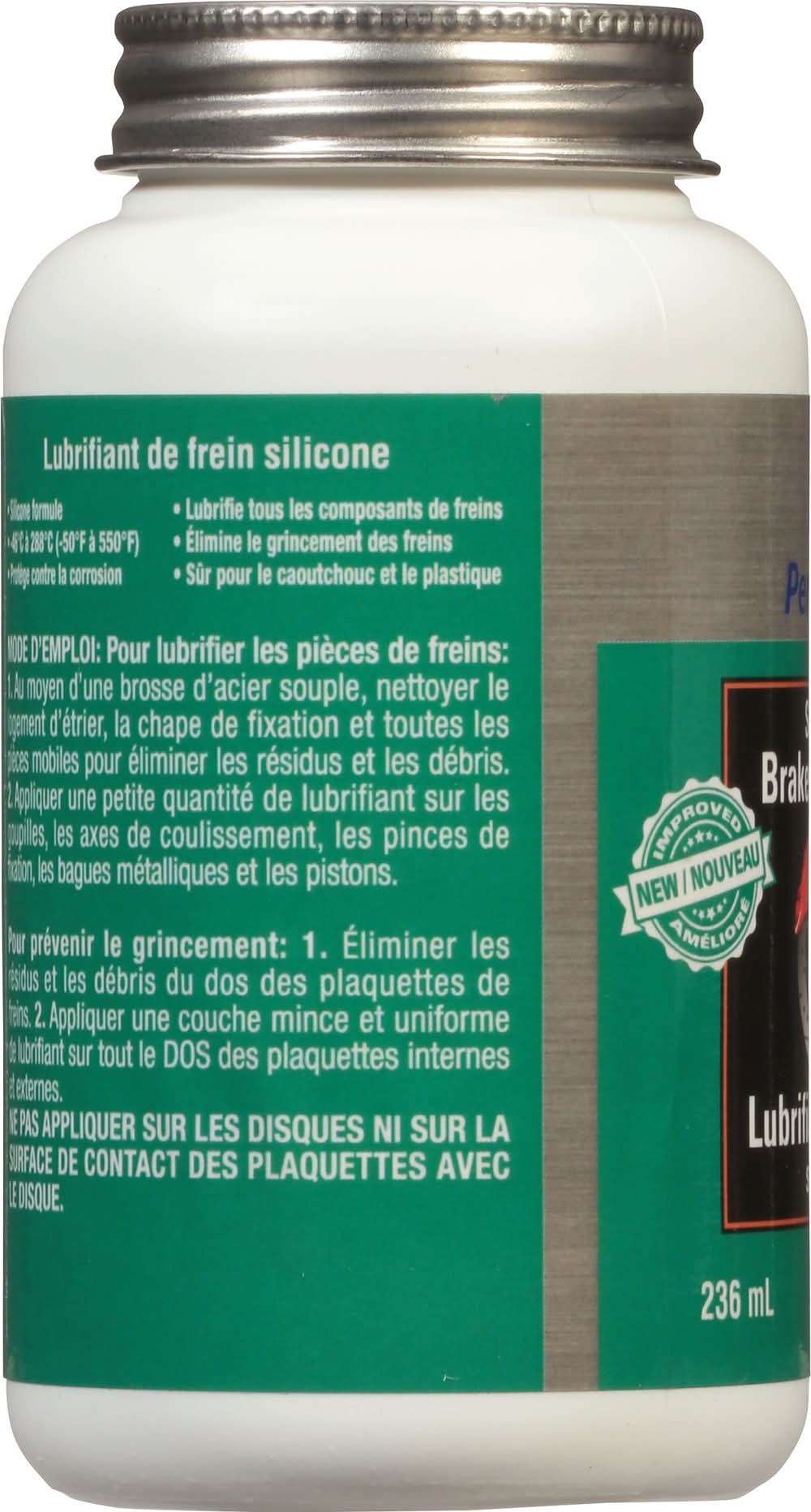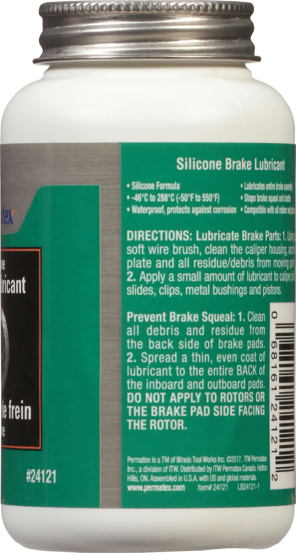 New. Improved. Silicone formula. -46 degrees C to 288 degrees C (-50 degrees F to 550 degrees F). Waterproof, protects against corrosion. Lubricates entire brake assembly. Stops brake squeal and chatter. Compatible with all rubber and plastics. www.permatex.com. Assembled in U.S.A. with U.S. and global materials. • ITW Permatex, • Packaging: Reusable