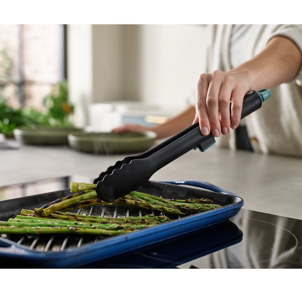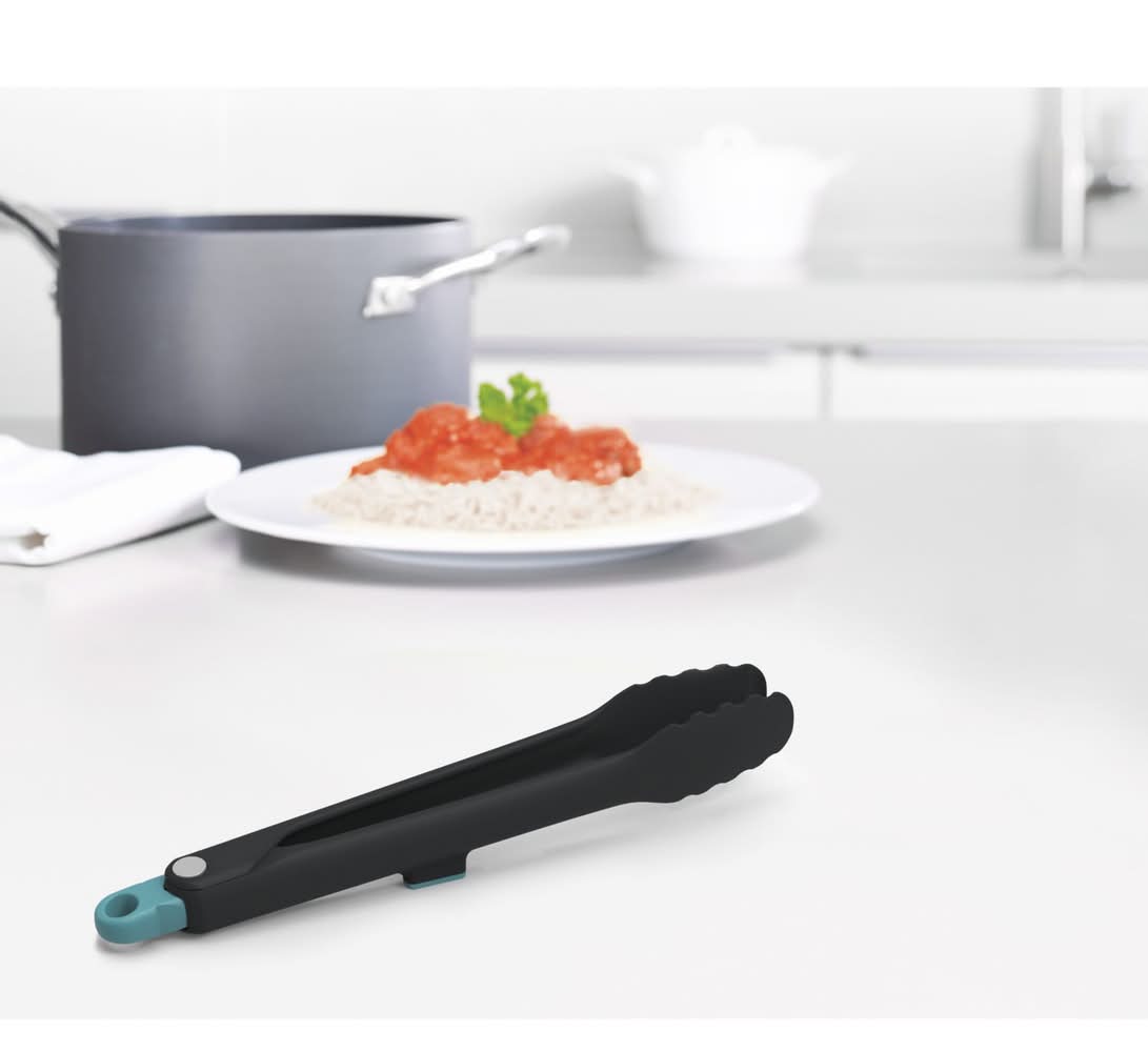 Lockable arms for ease of storage complete with an integrated tool rest. The non-slip feet elevate the tongs above the work surface improving hygiene and reducing mess. Non-stick cookware safe. Lockable arms Non-slip feet Heat-resistant up to 200°C/392°F Suitable for non-stick cookware Improves hygiene and reduces mess Color: Dark opal