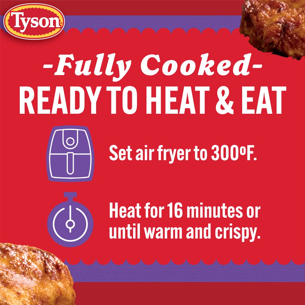 Bring the bold barbecue flavor to any event with our Flavored Wings. Fully cooked and full of flavor, our BBQ wings are an easy way to enjoy delicious chicken wings without all the hassle. Our frozen wings are made with 100% all natural* chicken raised with no added hormones or steroids and make for a delicious bite. Coated in BBQ sauce with a hint of smoke flavor, our BBQ chicken wings are perfect to enjoy as an appetizer or part of your meal. Whether you are watching the big game with friends or looking for an easy-to-make protein for your dinner, our wings are ready to deliver. With 13g of protein per serving, simply pop them in the air fryer or oven and prepare according to the directions on the package for delicious and crispy wings with big-time flavor. Keep our 22-ounce bag of BBQ Flavored Wings frozen until ready to prepare. • Flavor: Bbq • Tyson Sales and Distribution, Inc., PO Box 2020, Springdale, AR