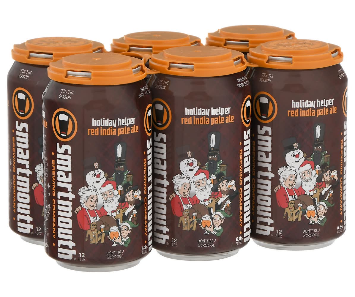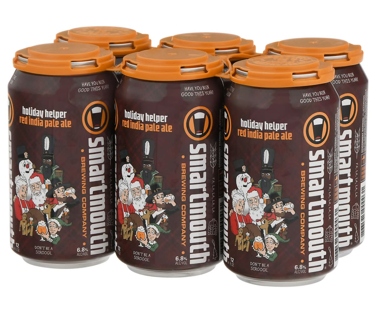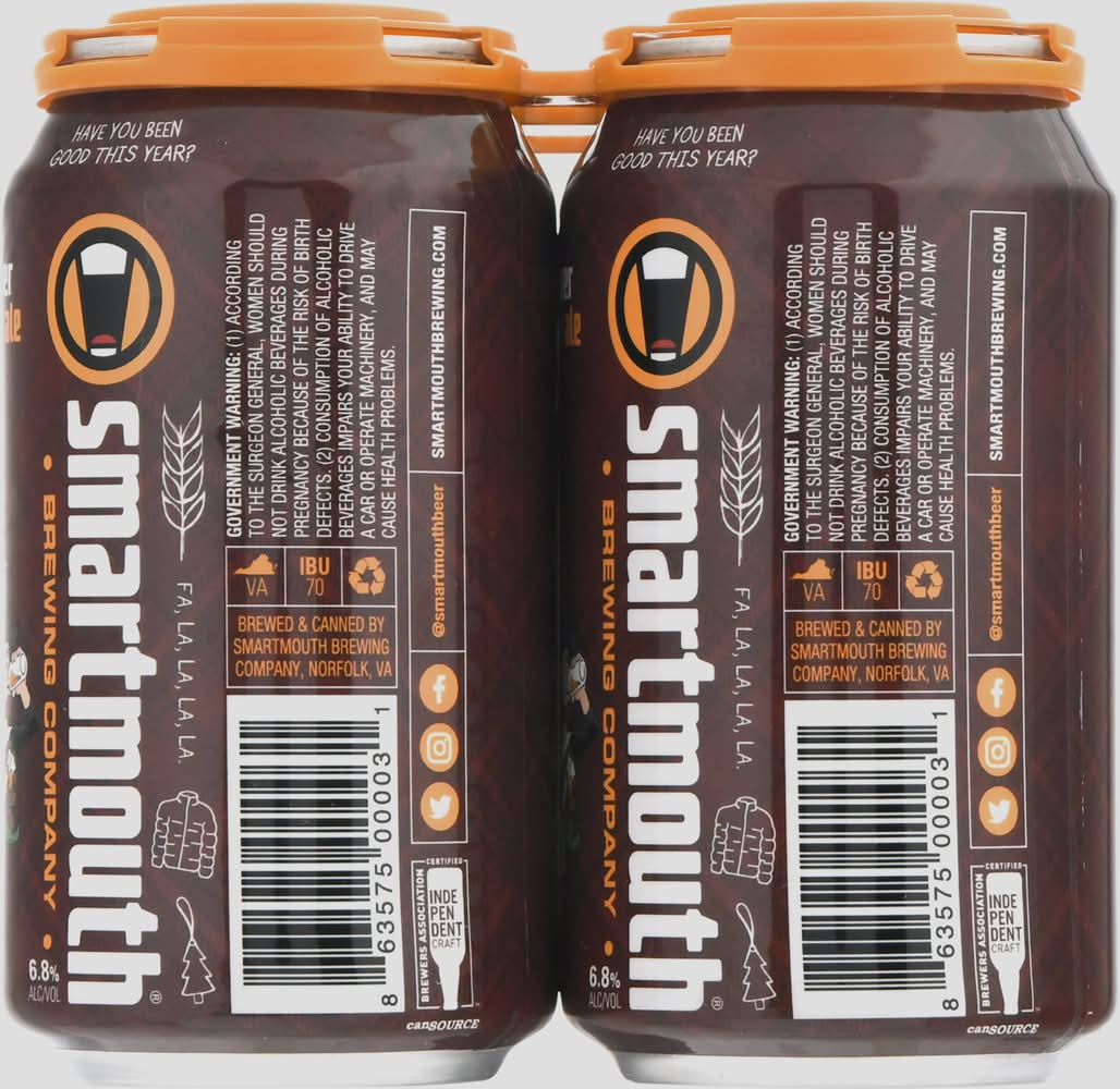Tis the season. Have you been good this year? Don't be a scrooge. Cozy on up! This ale boasts a crisp, sweet, spicy aroma and is sure to help get you through the holiday season. Its chocolate and caramel malts stand up to the spicy centennial and rye flavors, making this beer dangerously clean and smooth. It's a tasty brew that's eager to accompany you to all those festive gatherings. Can source. Certified Brewers Association Independent Craft. smartmouthbrewing.com. Facebook. Instagram. Twitter. (at)smartmouthbeer. 100% rHDPE recycled and Recyclable. 70. 6.8% alc/vol. 13.6 Virginia born & raised. Brewed & canned by Smartmouth Brewing Company, Norfolk, VA. • Alcohol by volume: 6.8% • Smartmouth Brewing Company,