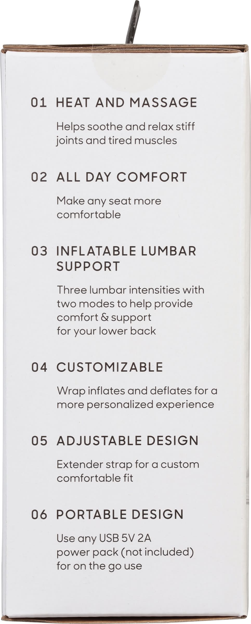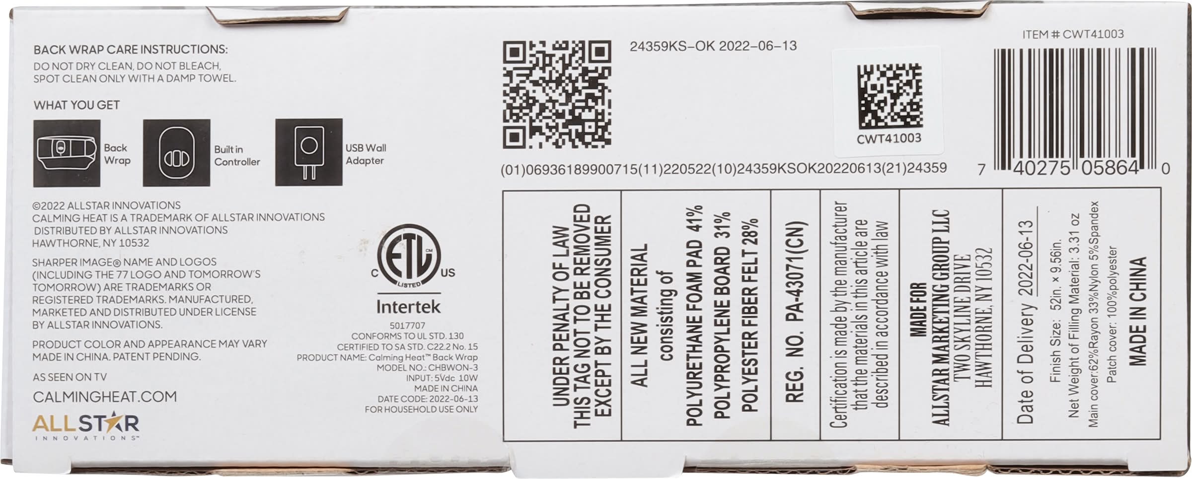 Model No: CHBWON-3 Pad Size: 52 in x 9.56 in (132.08 cm x 24.28 cm). Finish Size: 52 in x 9.56 in. Net weight of filling material: 3.31 oz Inflatable lumbar support. Soothing heat. Relaxing vibrations. Massaging vibrations. Inflatable lumbar support. 27 relaxing combinations. 9 Settings 3 heat. 3 Massage. 3 Lumbar. 01. Heat and Massage: Helps soothe and relax stiff joints and tired muscles. 02. All Day Comfort: Male any seat more comfortable. 03. Inflatable Lumbar Support: Three lumbar intensities with two modes to help provide comfort & support for your lower back. 04. Customizable: Wrap inflates and deflates for a more personalized experience. 05. Adjustable Design: Extender strap for a custom comfortable fit. 06. Portable Design: Use any USB 5V 2A power pack (not included) for on the go use. Inflatable lumbar support soothing heat, and massage. Massaging vibrations 3 modes to relax and soothe. Soothing heat helps relax tired muscles. Lumbar support provides comfort & support for your lower back. 9 setting controller 3 heat settings 3 massages setting 3 lumbar intensities. How it Works: Calming Heat Back Wrap provides the perfect amount of soothing heat, massaging vibrations, and inflation in one for the ultimate relief. Choose from 3 levels of heat, 3 levels of massaging vibrations, and 3 lumbar intensities for your preferred comfort! Features 2 hour auto shut off for the heat setting and 15 minute auto shut off for the massaging vibrations and lumbar. Take relaxation to the next level. Tomorrow's. What you Get: Back wrap. Built in controller. USB wall adapter. All star innovations. For household use only. Product color and appearance may vary ETL listed. Certification is made by the manufacturer that the materials in this article are described in accordance with law. calmingheat.com. As seen on TV calmingheat.com. Made in China.