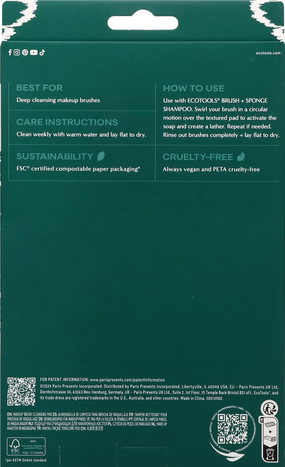 The EcoTools Makeup Brush Cleansing Pad is our reusable brush cleaning mat designed with a suction cup for easy, quick makeup brush deep cleanings. The textured pad helps to scrub all the makeup, oil, and other impurities from your favorite makeup brushes. Use our makeup brush cleaner with our best-selling EcoTools Makeup Brush + Sponge Shampoo for a deep cleanse. Just swirl your brush in a circular motion over the textured pad to activate the soap and create a lather. When your brush is clean, rinse it and lay it flat to air dry. Superior performance made sustainable. The EcoTools makeup brush cleaner mat is made from silicone, making it reusable. As with all our EcoTools products, this brush cleaner pad is 100% cruelty-free and vegan. Directions of Use: Use with EcoTools Brush + Sponge Shampoo. Swirl your brush in a circular motion over the textured pad to activate the soap and create a lather. Repeat if needed. Rinse our brushes completely and lay flat to dry. Cleaning, Care, and Maintenance: Clean with warm water and lay flat to dry. For more online video tutorials, plus tips and tricks on how to use our products, visit our YouTube channel.