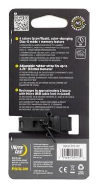 The rechargeable Go Lit is your guiding light from the bike trails to the neighborhood and beyond. Featuring a weather-resistant polycarbonate housing, this compact visibility light secures to bike bars, bag straps and other items up to 2.25 in. Dia with its adjustable rubber strap. Its Disc-O Tech LED module offers 4 selectable color options in glow or flash - red, green, blue or white - and color-changing Disc-O mode with a seamless color blend. Its built-in memory feature automatically saves your current color setting for the next time you turn back on and recharges in 2-hours with a micro USB cable (not included). • Color: Assorted • Size: 2.25 Inch