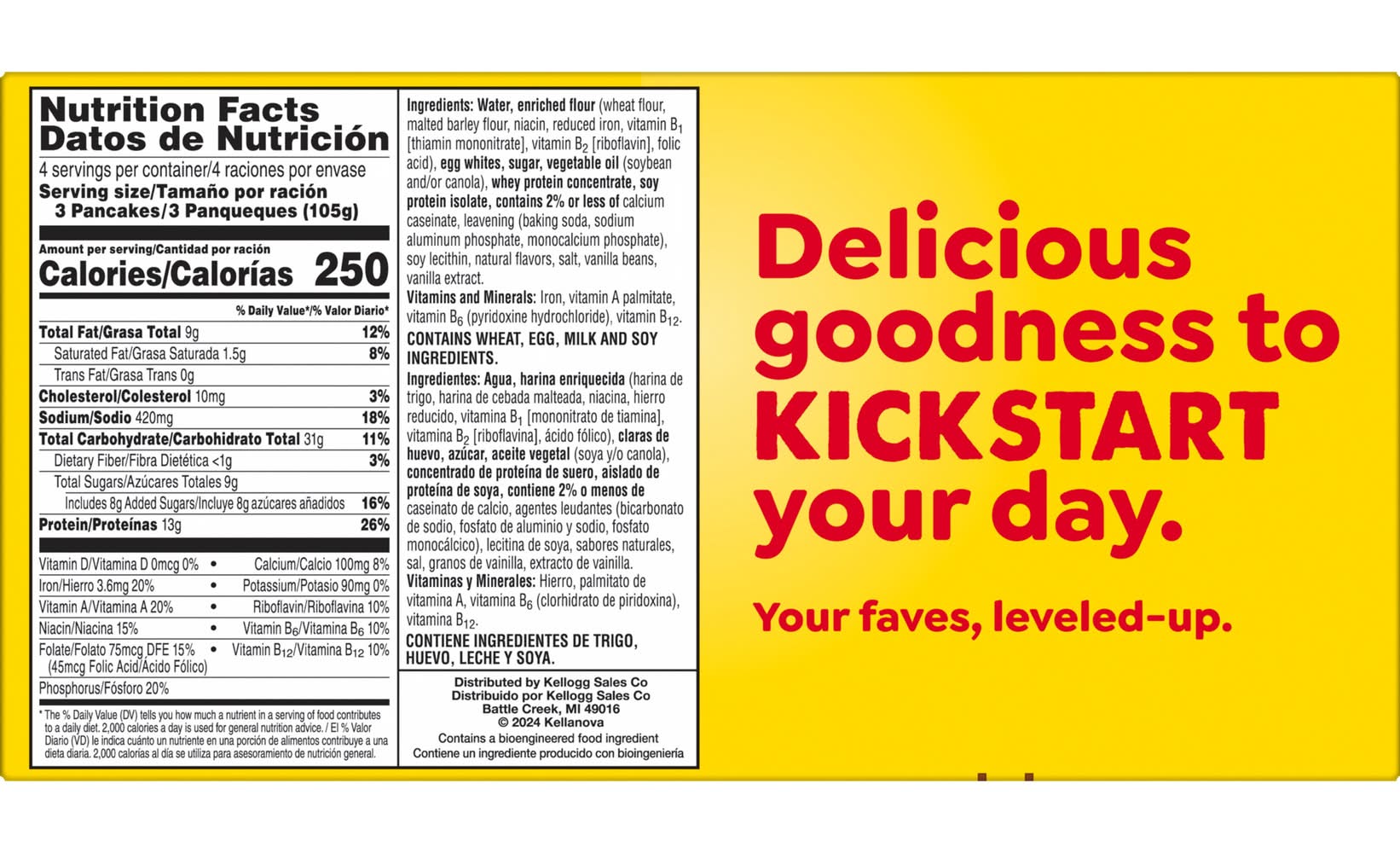 Eggo with an extra punch! Kickstart your day with a protein-packed breakfast with Eggo Protein Vanilla Pancakes. Crafted with delicious ingredients, you'll love the feel-good taste and decadent flavor of vanilla in every bite. Protein never tasted this good. They're your fave Eggo pancakes on a whole new level! Each serving of Eggo Protein Vanilla pancakes offers 13g of complete protein (complete protein contains all 9 essential amino acids in the recommended amounts per gram of protein, 26% daily value); Great for kids, busy teens, and adults, these protein-packed pancakes are made to enjoy as a part of a balanced breakfast. Pair with your favorite toppings like butter, syrup, fruit, or hazelnut spreads. Not just for breakfast, they make a warm, comforting afternoon treat, easy late-night bite, or a quick snack everyone will love. They are a delicious, protein-rich way to help amp up your day on their own or with your own spin. Give these leveled-up pancakes a try! • Flavor: Vanilla • Packaging: Reusable