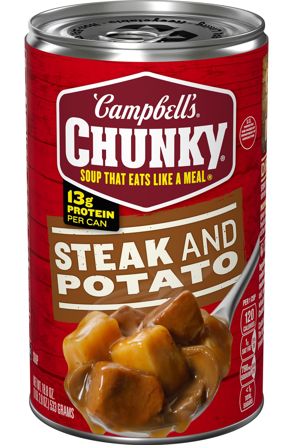 Campbell’s Chunky Steak and Potato Soup isn’t just tasty—it's made to work as hard as you do. With never-ending big flavors and bold ingredients, this canned soup is capable of fueling even the heartiest appetite. Simmered and seasoned to perfection, this ready-to-eat soup features tender potatoes and beef in a comforting beef broth. Each can has 13 grams of protein. It Fills You Up Right. Just pop this ready-to-serve soup in a microwave-safe bowl, heat and enjoy with your favorite sides. Or, warm it over the campfire on your outdoor adventures. Whether you’re looking for quick and easy to microwave soup for home or something to take on the go, Campbell’s has you covered. The soup can is recyclable for easy disposal. Take on the great outdoors with Campbell’s Chunky Steak and Potato Soup—Soup That Eats Like a Meal. Packaging: Reusable