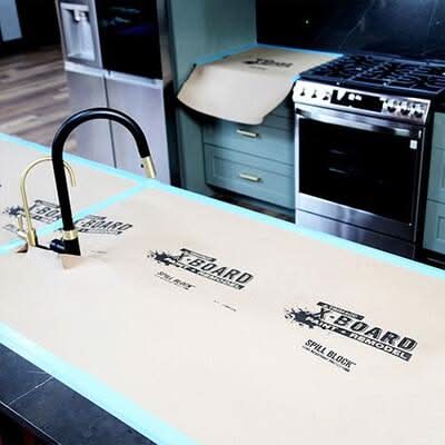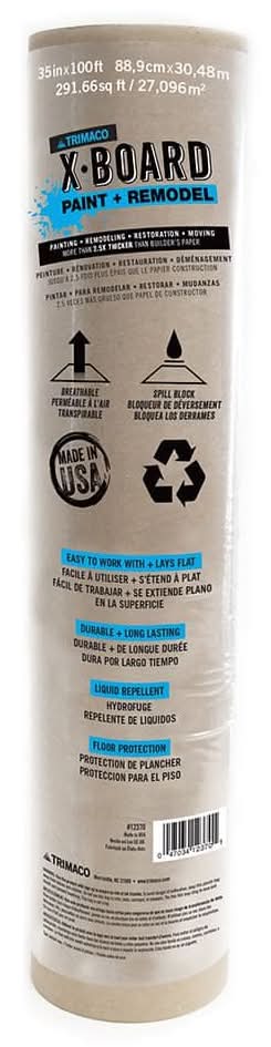 Trimaco's X-Board Paint + Remodel is breathable to allow floors to continue the curing process. This easy-to-use painter board lays flat when rolled out and our Spill Block technology ensures no paint, mud or water will get through to your surface. X-Board will last for the endurance of the job and features our innovative liquid repellent technology. Surface protector is proudly made in the USA. Size: 35 in x 100 ft