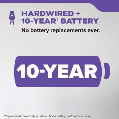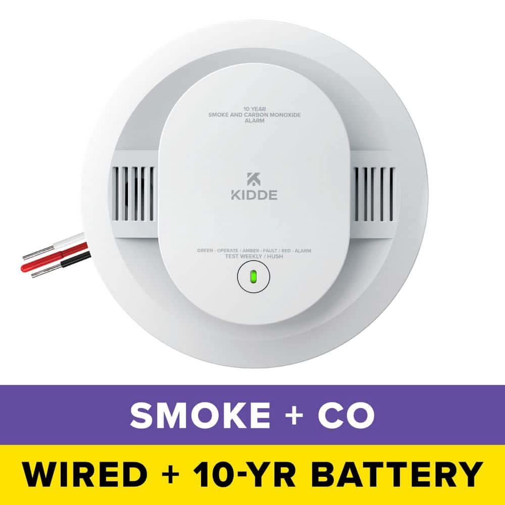 Experience the next level of fire safety with the Kidde Hardwired Smoke & Carbon Monoxide Detector, 10-Year Battery Backup, Interconnectable, LED Warning Lights, model 30CUA10. This smoke & CO detector has enhanced sensing technology that reduces false alarms often caused by cooking and sends fast alerts that help give your family more time to get out safely. To detect carbon monoxide, an electrochemical sensor is used. This alarm offers a modern 5-inch design ideal for all living spaces such as living rooms, hallways, kitchens, & bedrooms. Comprehensively tested and designed to the latest UL standard for safety and reliability, the 5-inch smoke & CO alarm is powered by 120V AC wiring with a 10-year built-in lithium battery, so you never have to change a battery for the life of the detector (not a battery performance claim). When smoke or carbon monoxide is detected, the red LED light will flash in time with the loud 85-decibel alarm to help you seek safety. A test-hush button allows you to test the battery operations as well as silence nuisance alarms, should they occur. In addition, it's self-testing and easy to install with the included twist-and-click mounting bracket. This Kidde combination alarm is equipped with end-of-life notifications that will beep to remind you it's time to replace it at the of its 10-year lifespan. Meets requirements of 9th Edition UL 217, UL 2034 4th Edition, FCC, and CSFM.