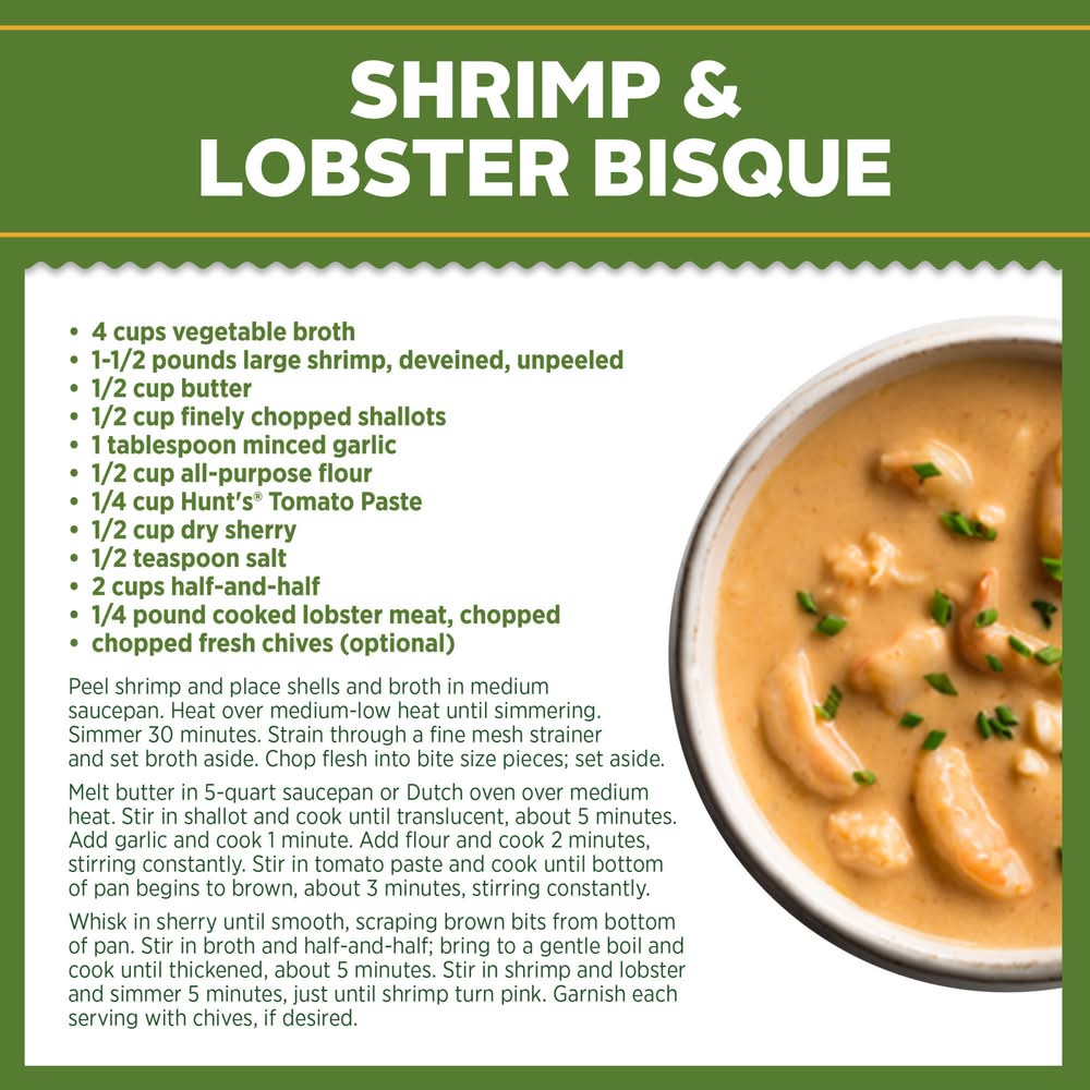 Get cooking with Hunt’s Tomato Paste. Perfect in chili, soups, and stews, versatile Hunt's Tomato Paste is made from all-natural, vine-ripened tomatoes, simmered with salt and natural spices. Using only concentrated, strained tomatoes makes this canned tomato paste extra thick and rich. From pasta sauce, soups and appetizers to sides and sauces, this tomato paste can is a flavorful addition to any recipe. Hunt's tomatoes are the trusted start to easy and delicious meals. This 100% natural canned tomato paste is Non-GMO Project Verified and contains no artificial preservatives or ingredients, so you can trust it is an ideal way to elevate meals for your family. Try Hunt's tomato paste canned tomatoes in chili, tomato soup, on toasted bread or in homemade pasta sauce. Ready when you need it, this thick and rich tomato paste is a pantry staple. Keep Hunt's tomatoes on hand for canned goods with delicious flavor. Great meals start with Hunt’s. • Conagra Brands, Chicago, IL, 60654 • Packaging: Reusable