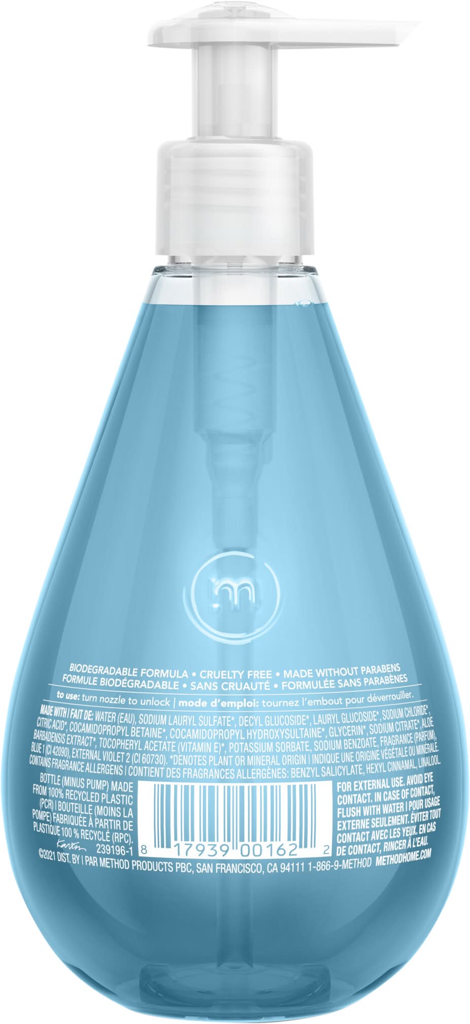 Hand wash with plant-based cleaners. Made without parabens. methodhome.com. Bottle (Minus pump) made from 100% recycled plastic (PCR). Biodegradable formula. Cruelty free. Packaging: Reusable