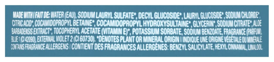 Ingredients: Made with: Water (Eau), Sodium Lauryl Sulfate (Denotes Plant or Mineral Origin), Decyl Glucoside (Denotes Plant or Mineral Origin), Lauryl Glucoside (Denotes Plant or Mineral Origin), Sodium Chloride (Denotes Plant or Mineral Origin), Citric Acid (Denotes Plant or Mineral Origin), Cocamidopropyl Betaine (Denotes Plant or Mineral Origin), Cocamidopropyl Hydroxysultaine (Denotes Plant or Mineral Origin), Glycerin (Denotes Plant or Mineral Origin), Sodium Citrate (Denotes Plant or Mineral Origin), Aloe Barbadensis Extract (Denotes Plant or Mineral Origin), Tocopheryl Acetate (Vitamin E) (Denotes Plant or Mineral Origin), Potassium Sorbate, Sodium Benzoate, Fragrance (Parfum), Blue 1 (CI 42090), External Violet 2 (CI 60730)