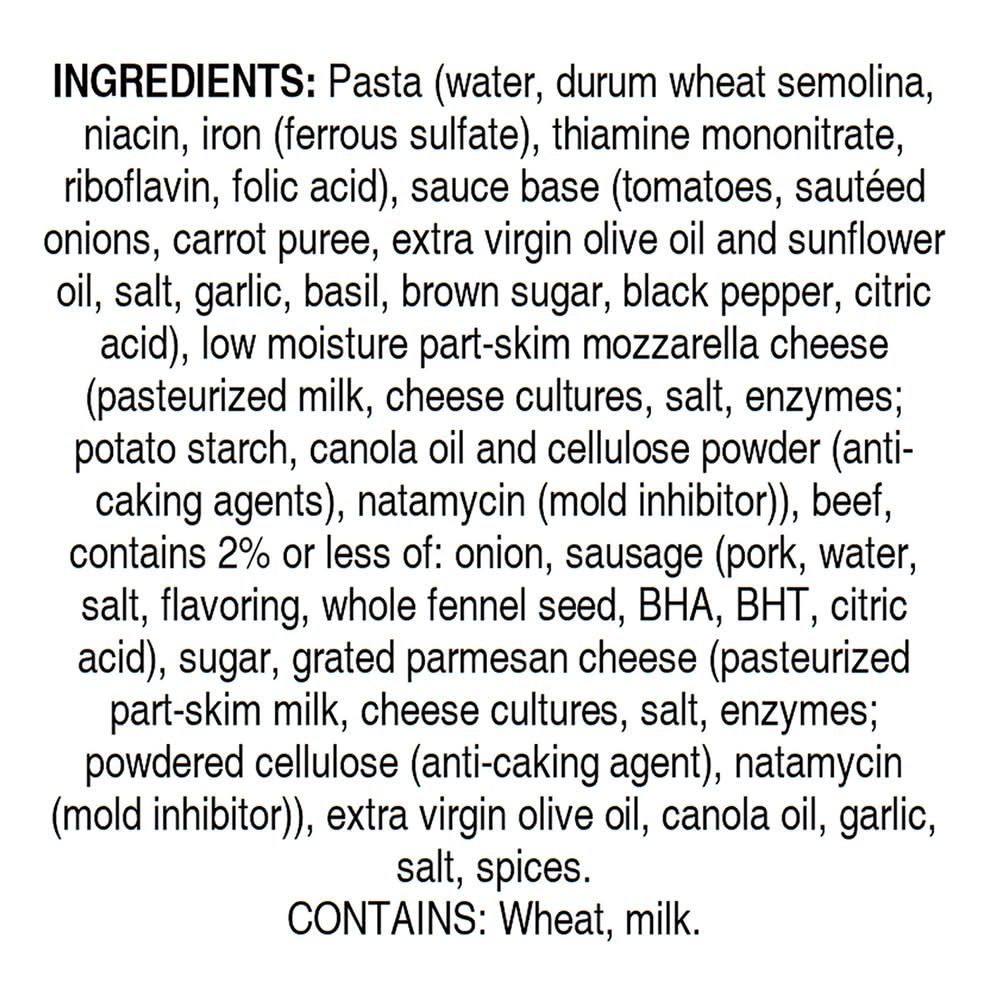 Pasta (Water Durum Wheat Semolina Niacin Iron (Ferrous Sulfate), Thiamine Mononitrate, Riboflavin, Folic Acid), Sauce Base (Tomatoes Sauteed Onions Carrot Puree Extra Virgin Olive Oil and Sunflower Oil Salt Garlic Basil Brown Sugar Black Pepper Citric Acid), Low Moisture Part-Skim Mozzarella Cheese (Pasteurized Milk Cheese Cultures Salt Enzymes; Potato Starch Canola Oil and Cellulose Powder (Anti-Caking Agents), Natamycin (Mold Inhibitor)), Beef, Contains 2% or Less of: Onion, Sausage (Pork Water Salt Flavoring Whole Fennel Seed BHA BHT Citric Acid), Sugar, Grated Parmesan Cheese (Pasteurized Part-Skim Milk Cheese Cultures Salt Enzymes; Powdered Cellulose (Anti-Caking Agent), Natamycin (Mold Inhibitor)), Extra Virgin Olive Oil, Canola Oil, Garlic, Salt, Spices Contains: Wheat, Milk