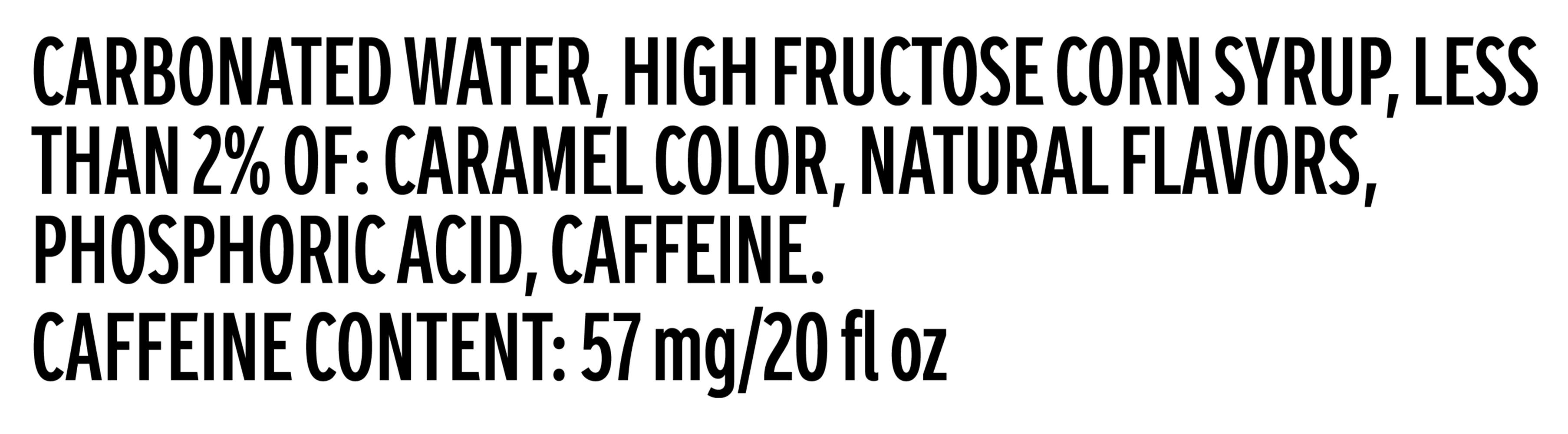 Ingredients: Carbonated Water, High Fructose Corn Syrup, Less Than 2% Of: Caramel Color, Natural Flavors, Phosphoric Acid, Caffeine.