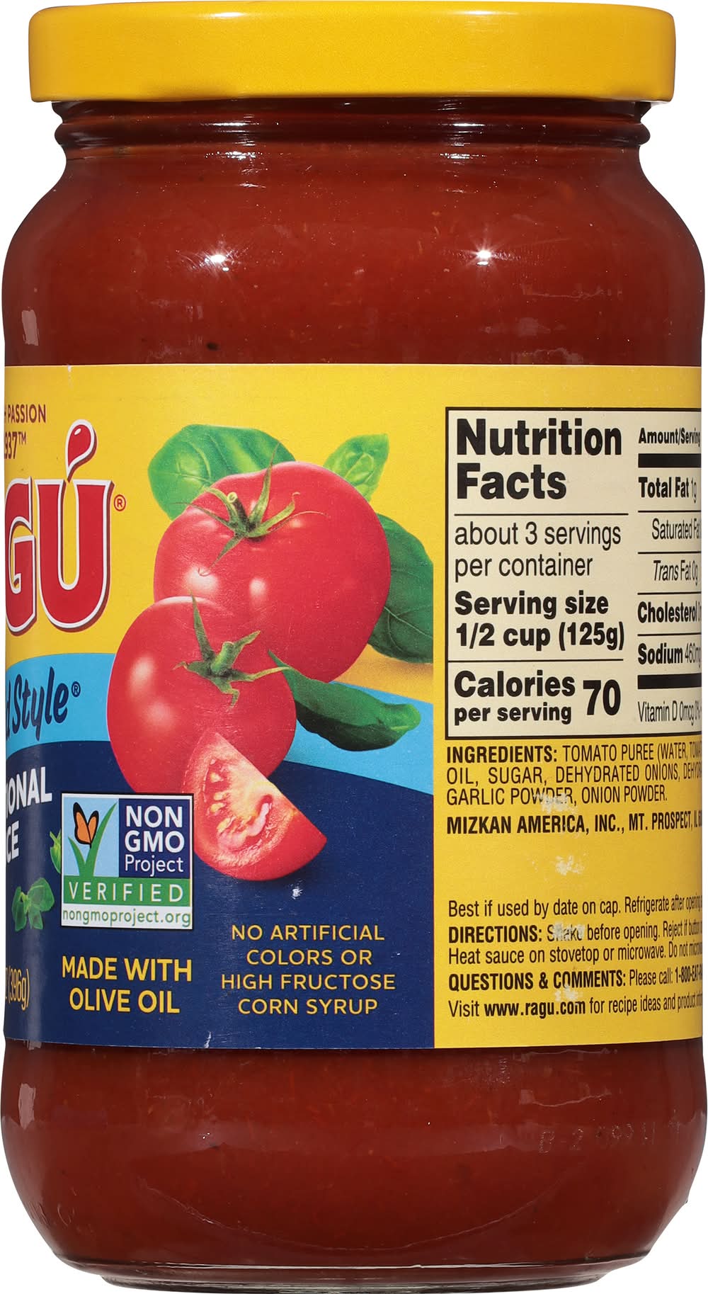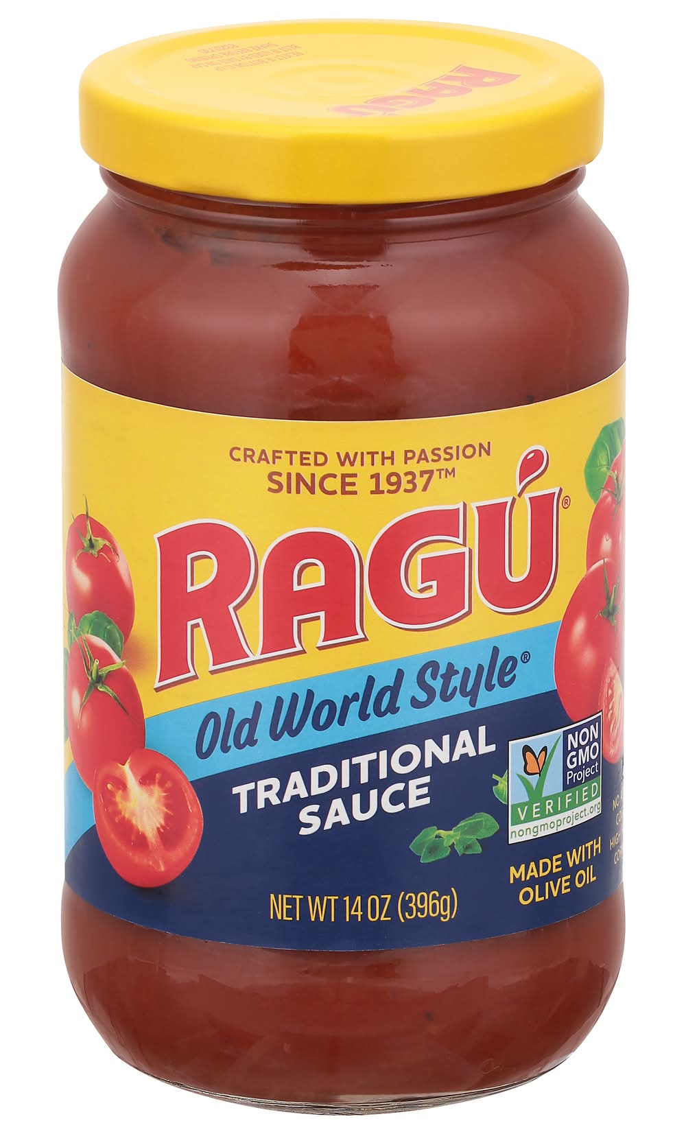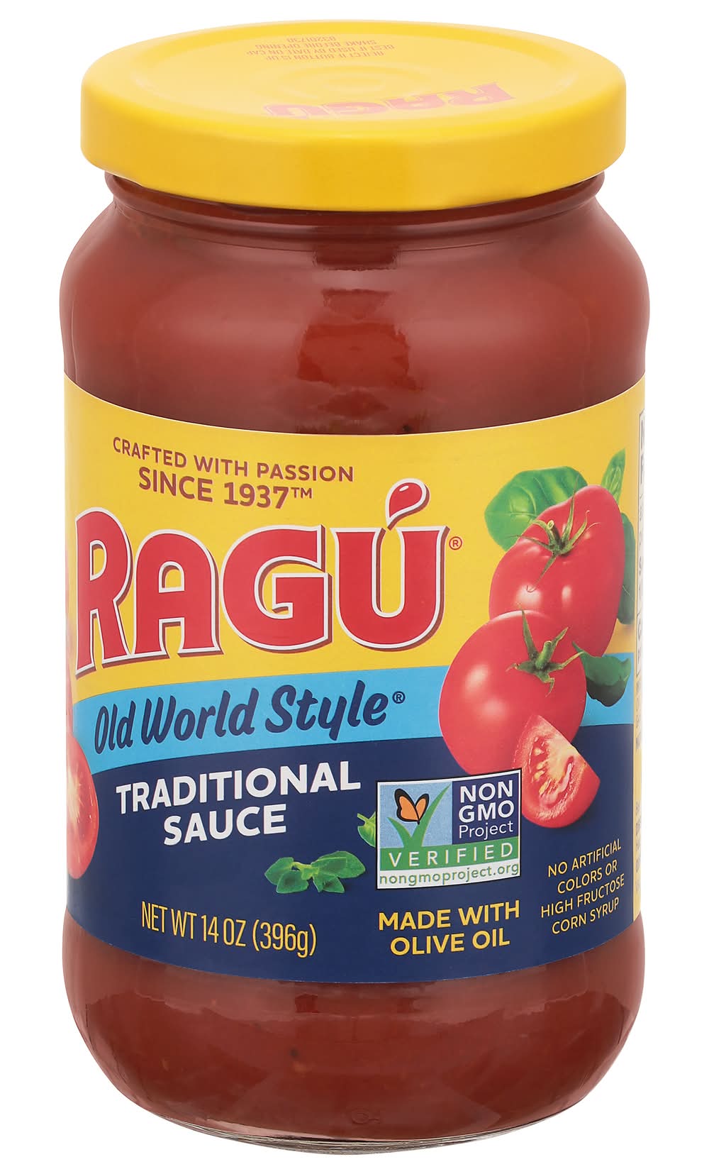 Non-GMO Project verified. nongmoproject.org. Crafted with passion since 1937. No artificial colors or high fructose corn syrup. www.ragu.com. Questions & Comments: Please call: 1-800-Eat-RAGU (1-800-328-7248). Visit www.ragu.com for recipe ideas and product information.