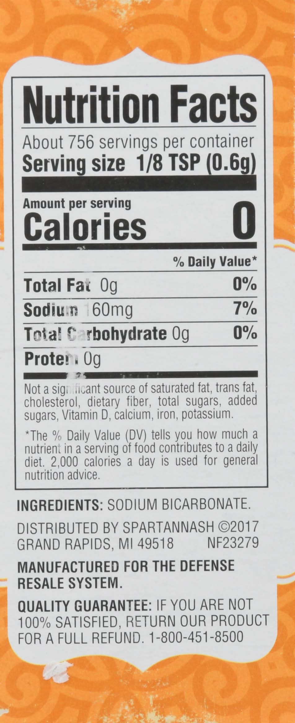 Per 1/8 Tsp: 0 calories; 0 g sat fat (0% DV); 160 mg sodium (7% DV); 0 g total sugars. Baking. Cleaning. Deodorizing. Change by month day year. Quality Guarantee: If you are not 100% satisfied return our product for a full refund. 1-800-451-8500. Spartannash,
