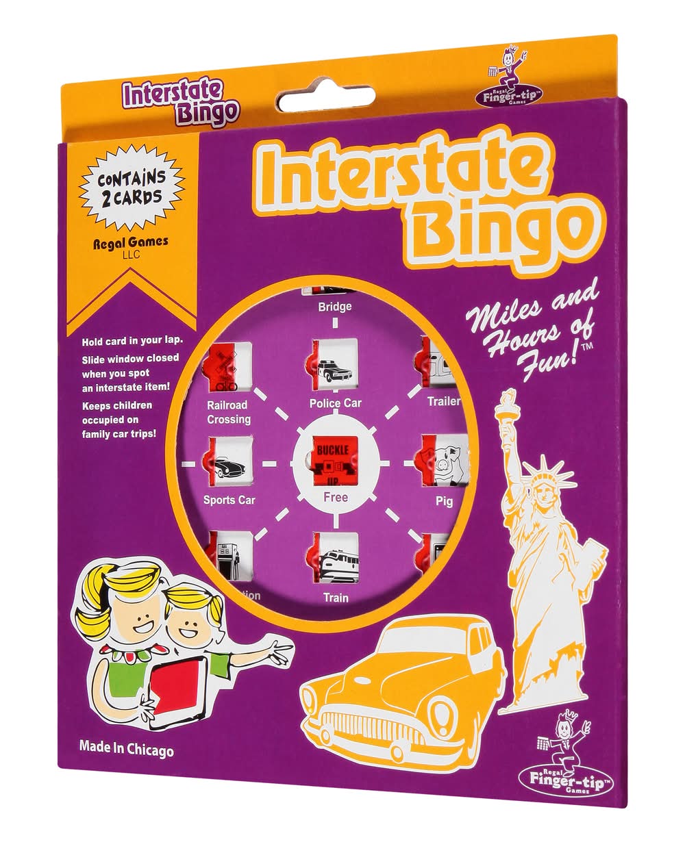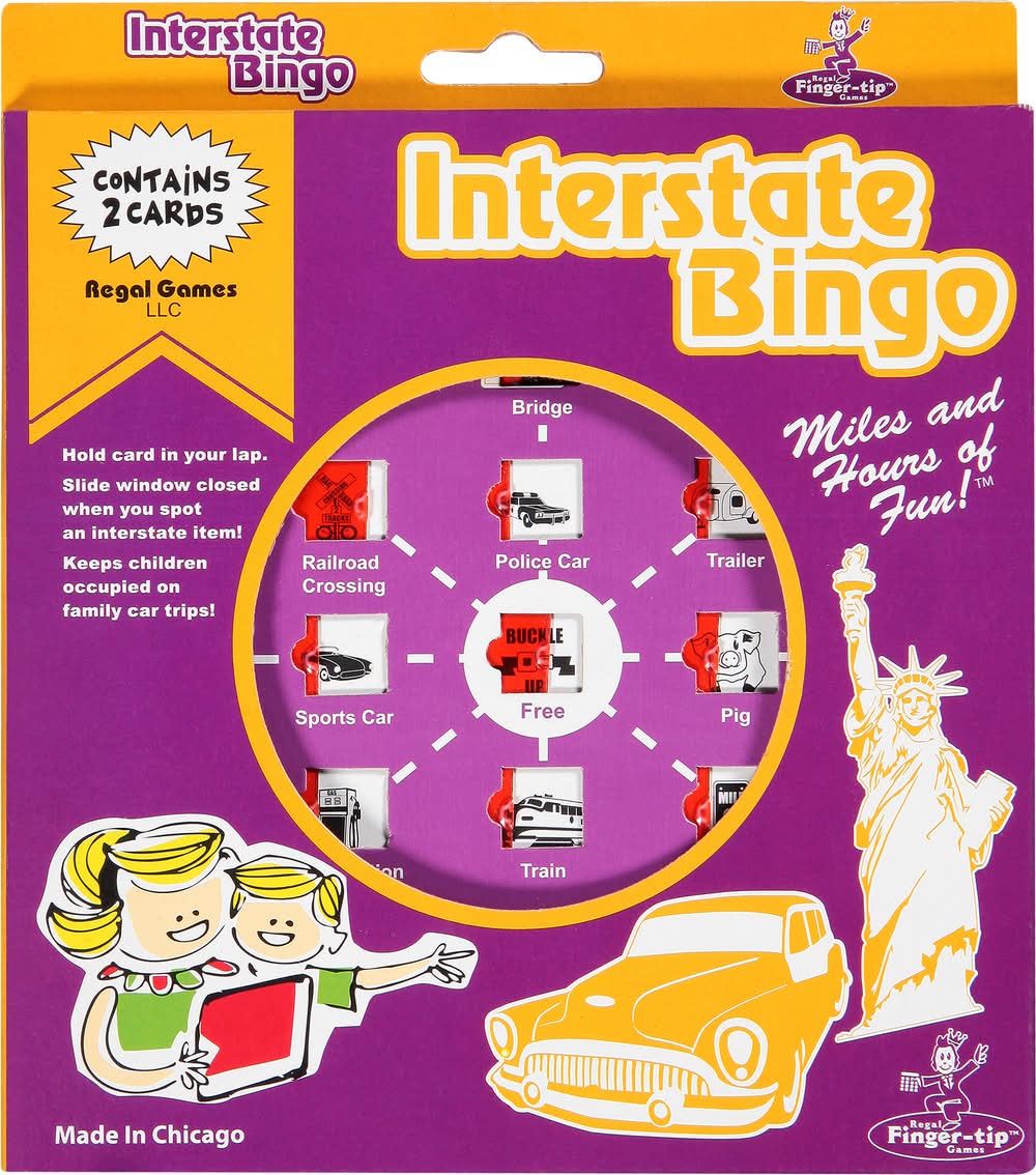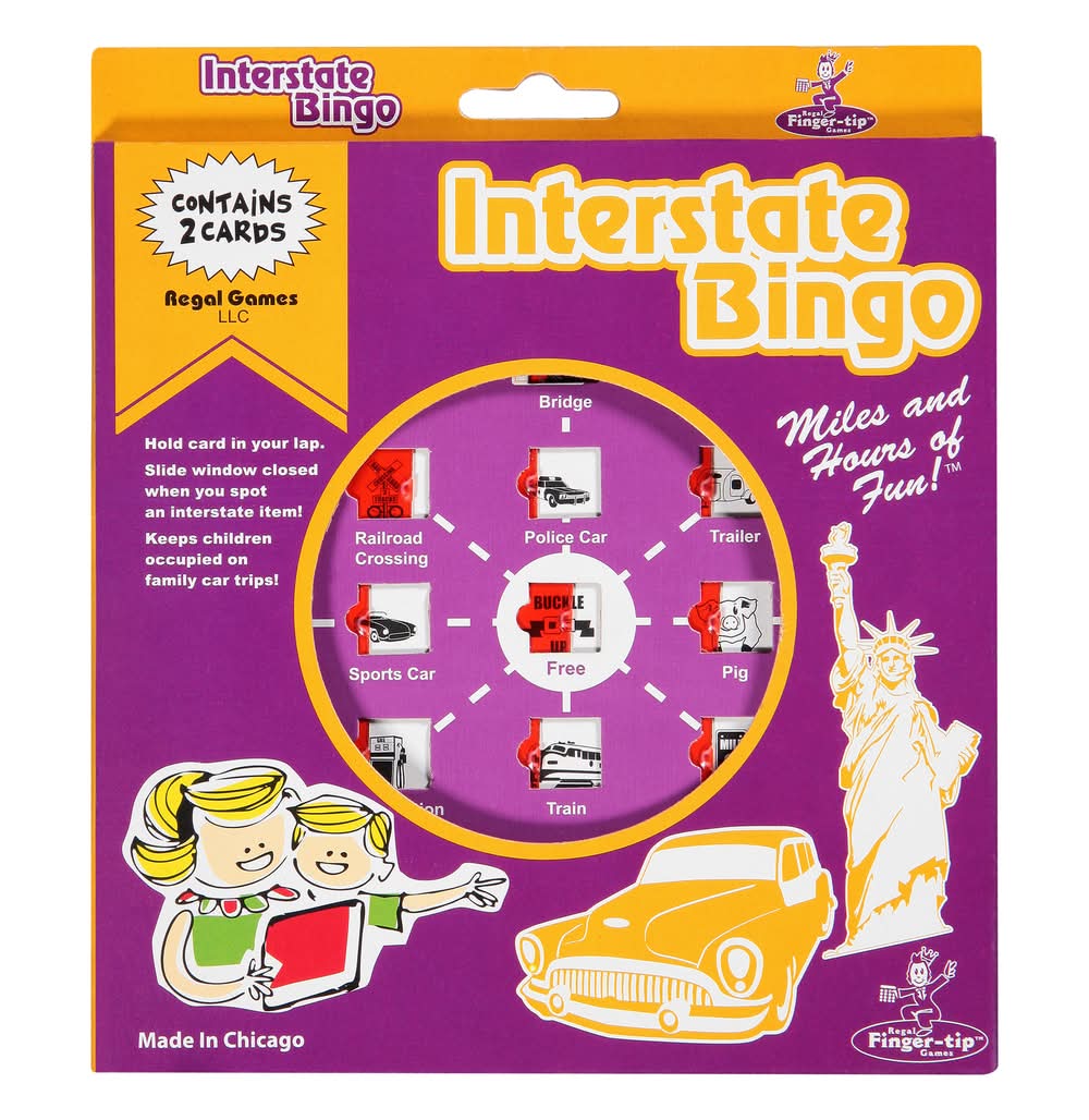 Contains 2 cards. Hold card in your lap. Slide window closed when you spot an interstate item! Keeps children occupied on family car trips. Miles and hours of fun! Miles and hours of fun for adults and children. Made in Chicago. Made in USA. Regal Games,