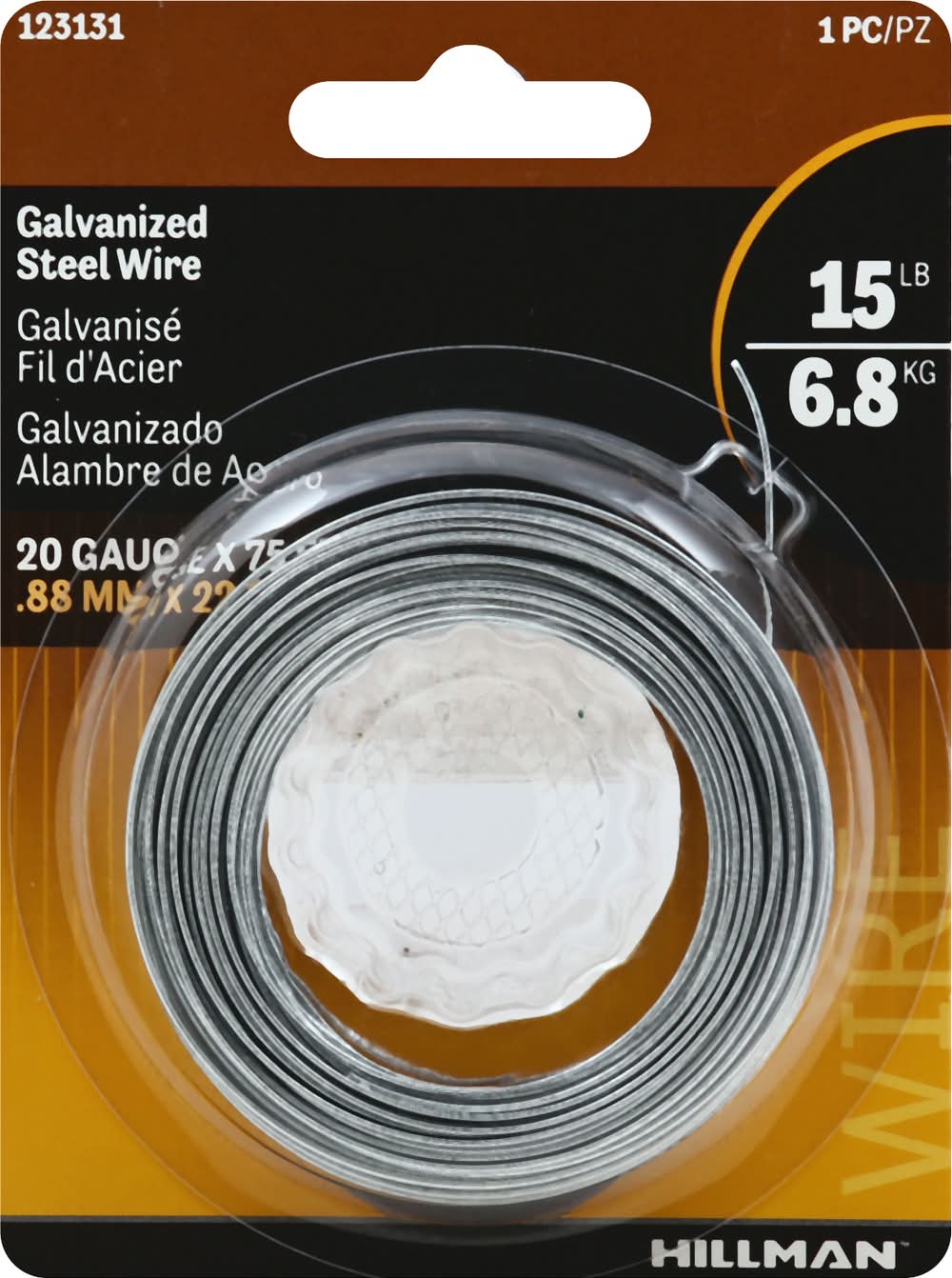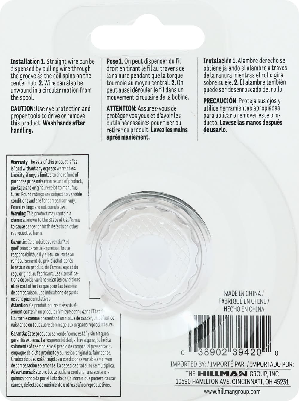 20 gauge x 75 ft (0.88 mm x 22 m). 15 lb (6.8 kg). www.hillmangroup.com. Made in China. Hillman Group,