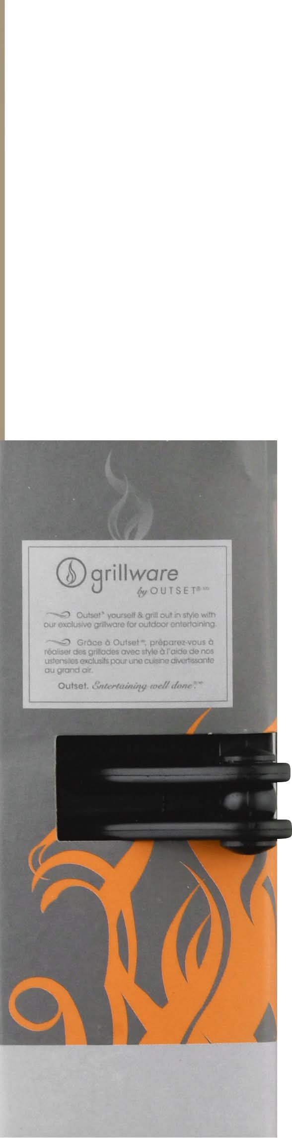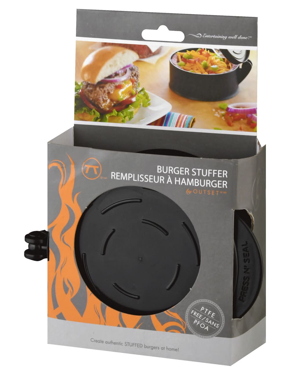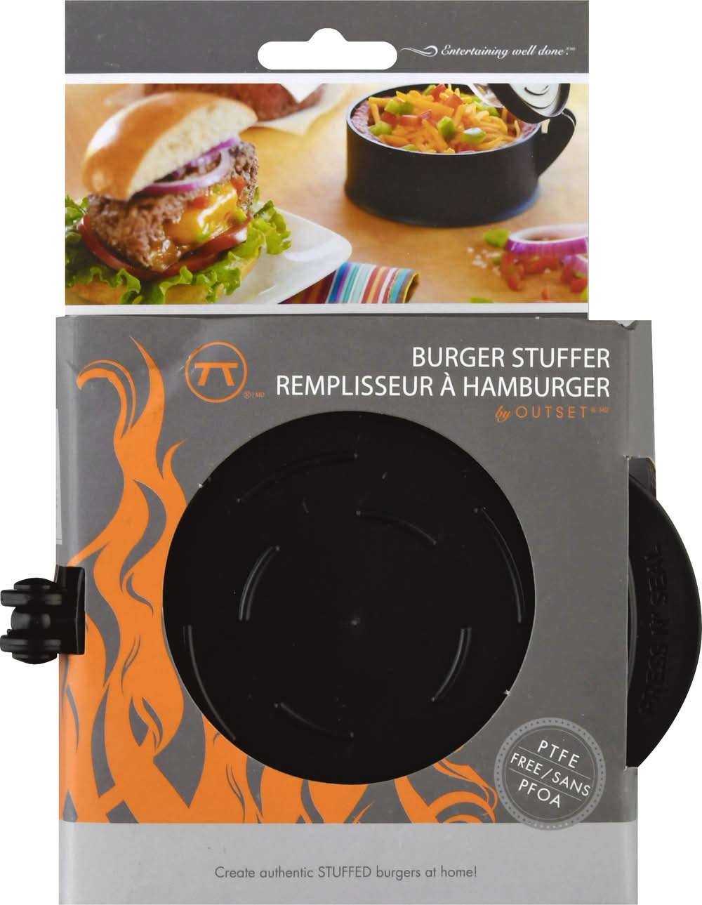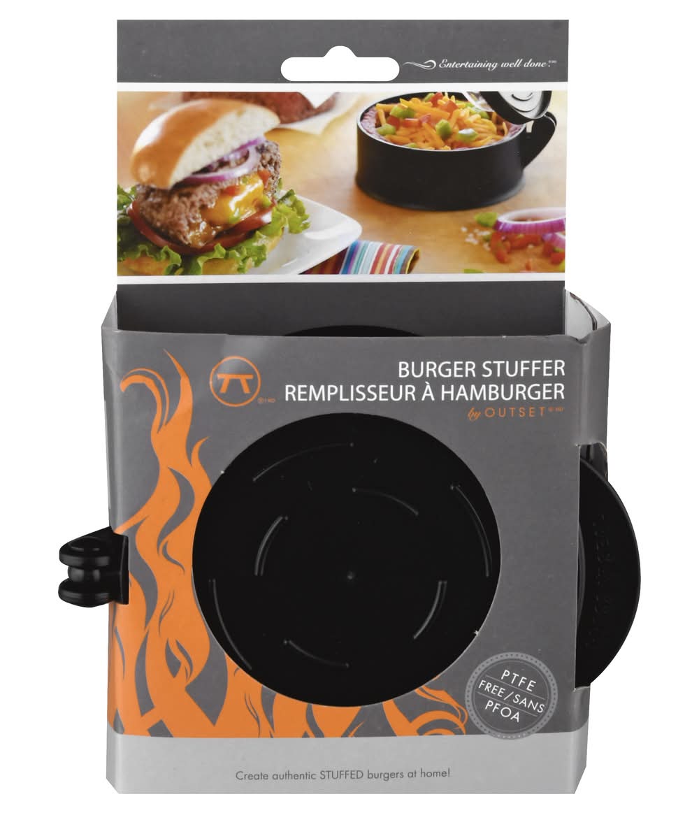 PTFE free. Create authentic stuffed burgers at home! Outset yourself & grill, out in style with out exclusive grillware for outdoor entertaining. Outset. Entertaining well done. Features: Creates perfect stuffed burgers that will cook evenly. Works with any ground meat. Makes 1/2 lb. or 3/4 lb stuffed burgers. Detailed instructions includes inside. www.outsetinc.com. Made in China. Fox Run USA,