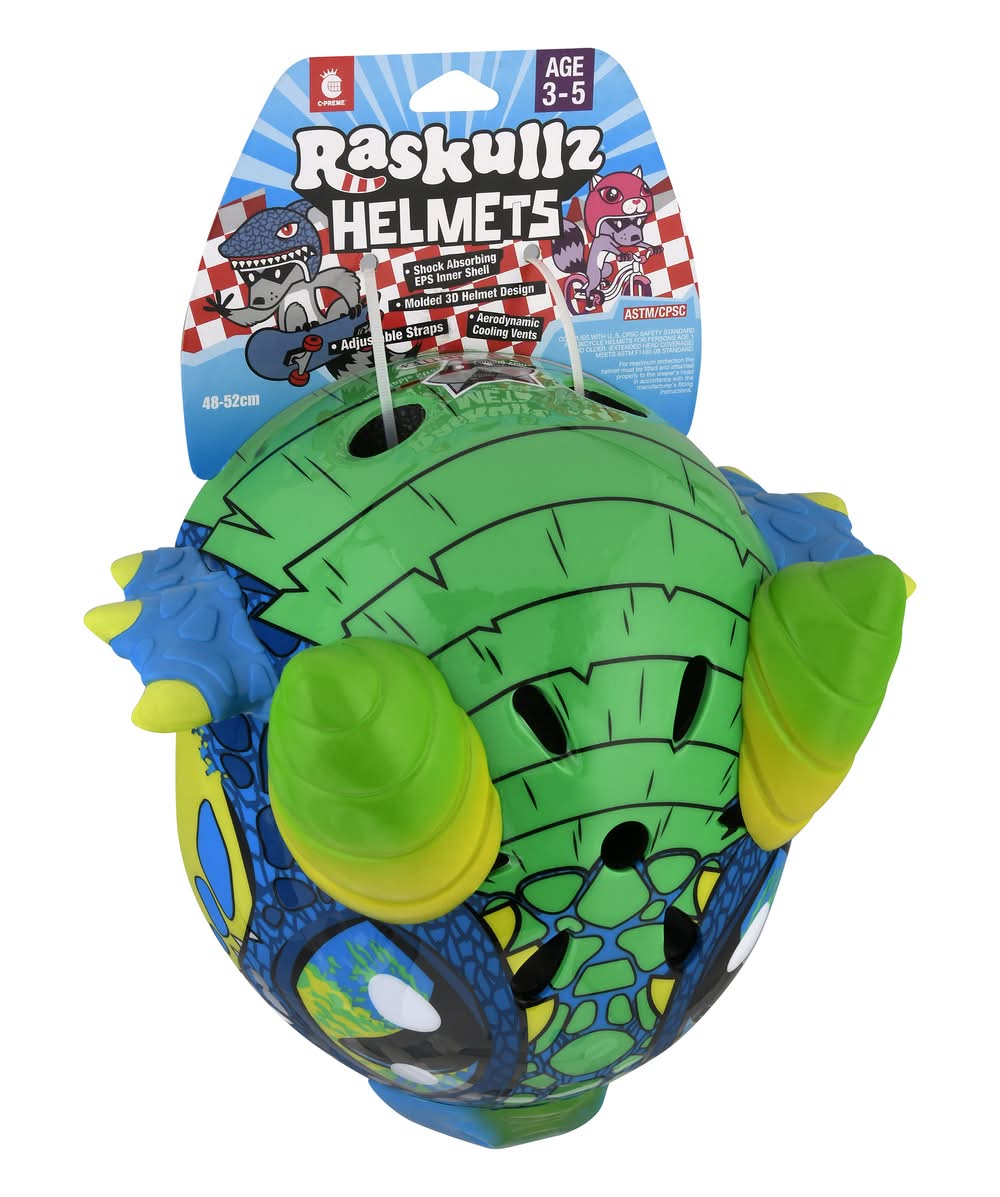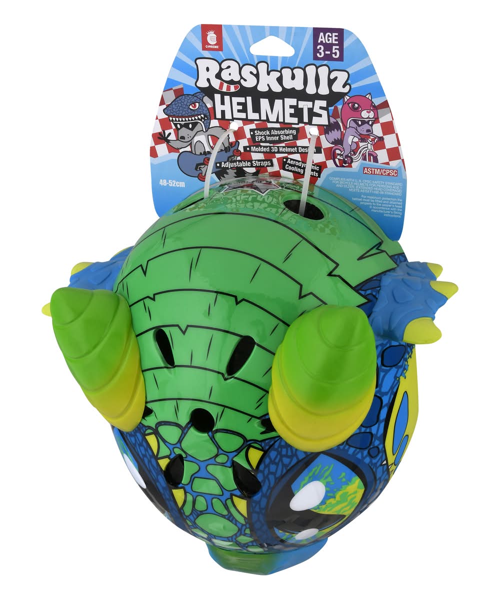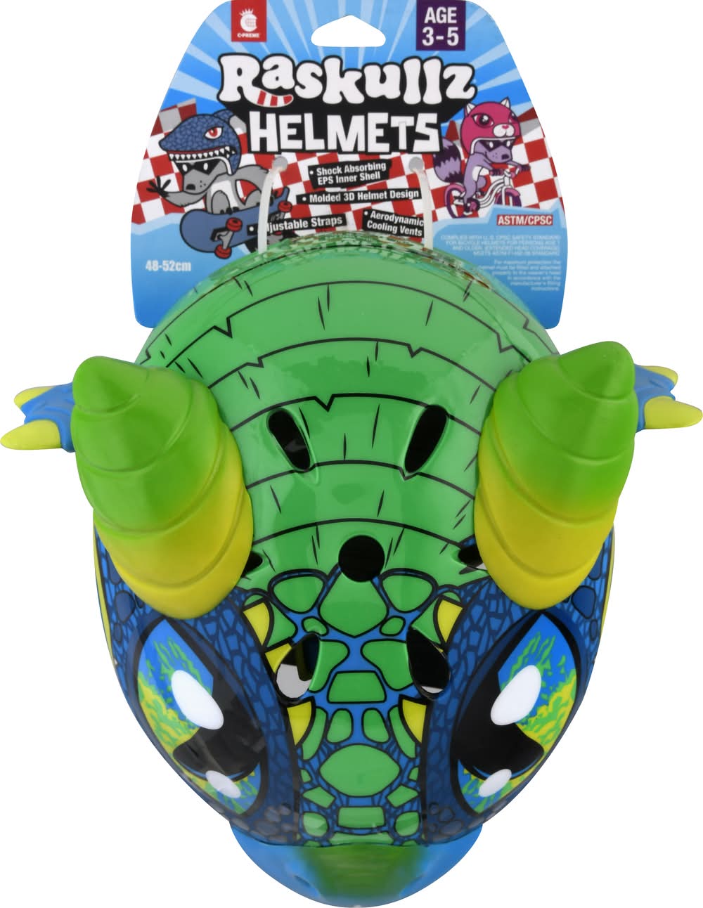 Age 3-5. Shock absorbing EPS inner shell. Molded 3D helmet design. Adjustable Straps. Aerodynamic cooling vents. 48-52 cm. Protection and Ventilation: The outer shell allows the helmet to be one of me lightest helmets while providing excellent durability and integrity. The multiple vents with inner air channels draw the air throughout the helmet and over the brow for maximum cooling Fitting: The helmet is designed to be retained by a strap under the lower jaw. To be effective, a helmet must fit and be worn correctly. To check for correct fit, place helmet on the head and make any adjustment indicated. Securely fasten retention system. Grasp the helmet and try to rotate it to the front and rear. A correctly fitted helmet should be comfortable and should not move forward to obscure vision or rearward to expose the forehead. To ensure a proper fit, mix and match the pad thickness to best conform to your head shape. Retention System: This helmet uses a retention system that is simple and can be buckled and unbuckled without changing the adjustment. The straps must be snug and evenly tensioned. The helmet is designed to be retained by a strap under the lower jaw. Place helmet firmly on your head and fasten the buckle. To tighten the rear strap, pull excess from the rear of Strap (2) Hold the helmet with one hand. With the other hand, hold the strap where they pass under your chin. Then pull from side to side to balance the length of all your straps. The helmet must sit firmly and level on your head. To lower the front of the helmet in order to cover your forehead, tighten the chin strap and loosen the rear strap. To raise front, loosen the chin strap and tighten the rear strap. Final Check: The important thing to remember is that the helmet must fit snugly. If you can tilt it forwards or backwards, you will need to tighten the strap adjustment. It is important for the helmet to fit snug on your head and be properly fastened to provide maximum protection. All adjustments should be checked each time the helmet is worn, making sure it fits snug each time. Complies with U.S. CPSC safety standard for bicycle helmets for persons age 1 and older. (extended head coverage) meets ASTM f1492-08 standard. Safety Information: If your helmet bears the CPSC designation, it meets the CPSC 1203: Safety standard for bicycle helmets requirements of the consumer product safety commission. If your helmet bears the ASTM designation, it meets the ASTM F1492: Standard for Helmet used in skateboarding and trick roller skating requirements of the American society of testing and materials. If your helmet bears the AS/NZS designation, it meets the AS/NZS 2063 safety requirement, of the council of standards Australia and the council of standards New Zealand. If your helmet bears the CE designation, it meets the EN 1078 safety requirements of the European committee for standardization. Raskullz.com. Made in China. Color: Burgundy