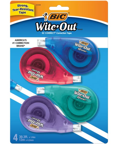 Quickly correct typed or handwritten documents with BIC White-Out Brand EZ Correct Correction Tape. Quickly correct typed or handwritten documents with BIC White-Out Brand EZ Correct Correction Tape. Made by America’s #1 Correction Brand*, this correction tape goes on dry, allowing you to make instant corrections with no mess and no waiting time unlike the correction fluid white out liquid. Dispensing the tape is easy: simply hold the dispenser with your thumb in the groove, position the tip flat on your paper, press down firmly, and gently move from left to right. Offering greater strength than paper-based tape, this film-based correction tape is more tear resistant to create tidy, inconspicuous corrections that last. The self-winding mechanism helps prevent the tape from loosening, so you can apply the tape smoothly and accurately. And thanks to its translucent body, the dispenser lets you see how much tape is remaining. - One 4-count pack of BIC Wite-Out EZ Correct Correction Tape - Applies dry, write over instantly - Tear-resistant, film-based tape - Fast, clean and easy to use - Translucent body provides visible tape supply - America's #1 Correction Brand - 39.3 feet of correction tape (472 inches) - Cartridge colors may vary, same great wite out tape *Source: The NPD Group, Inc./ U.S. Retail Tracking Service/ Dollar Sales (Retail & Commercial Combined)/ Jan - Dec 2019