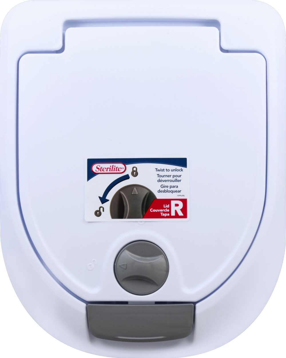 28 l. Base R. Lid R. www.sterilite.com. Made in USA with imported springs. STERILITE,