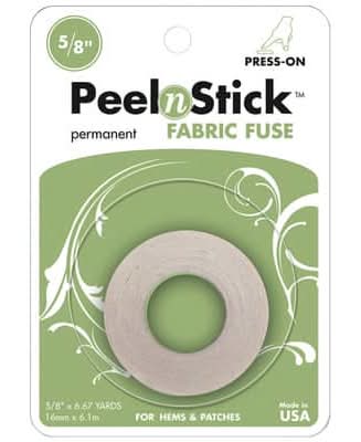 Fabric Fuse is a washable, double-sided press-on adhesive specifically designed for fabric. 5/8" x 6.67yd. (16mm x 6.1m). Machine washable and dryable. Permanent, strong, instant bond. Peel n Stick Fabric Fuse Roll Size: 16 mm x 6.1 m