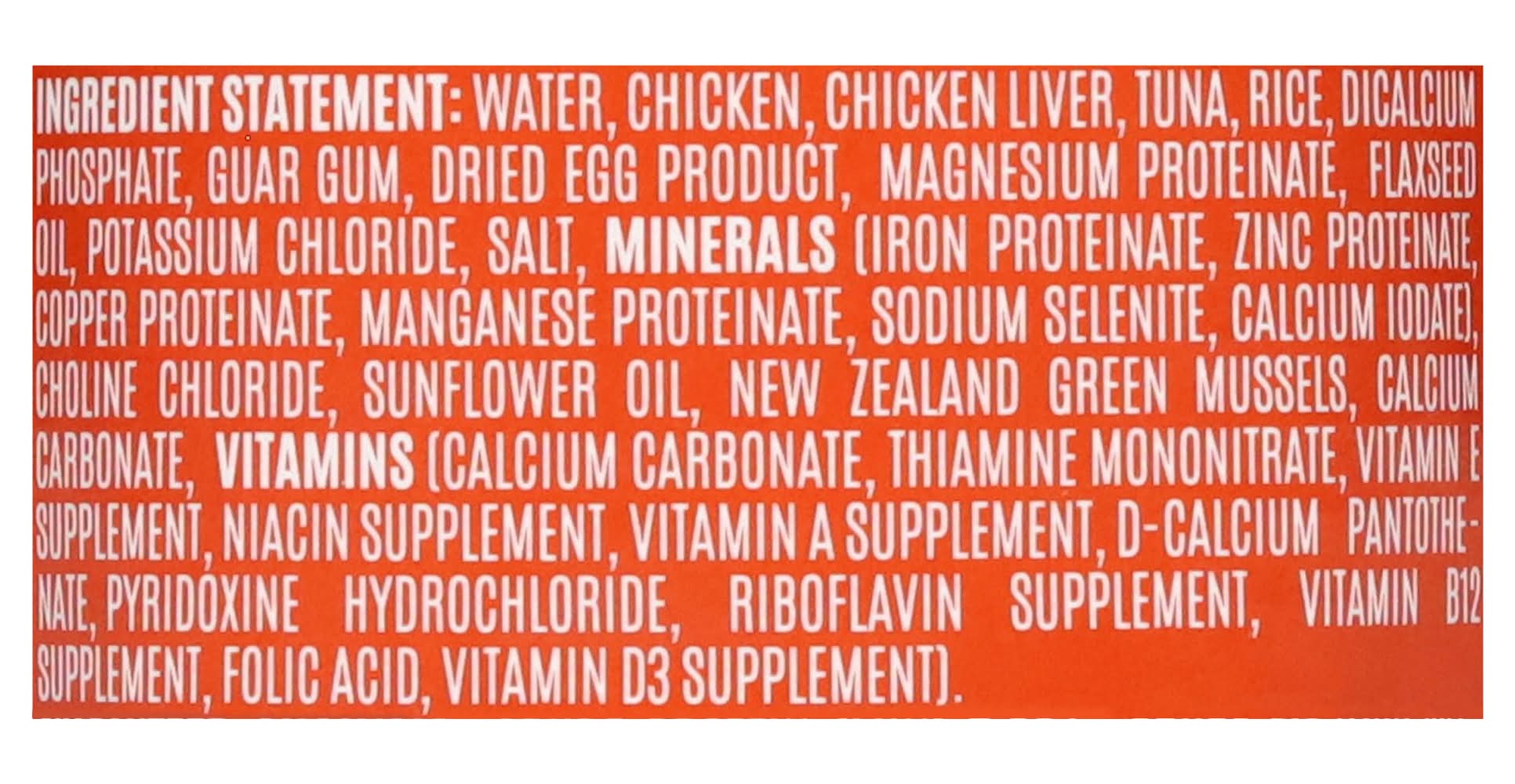 Ingredients: Water, Chicken, Chicken Liver, Tuna, Rice, Dicalcium Phosphate, Guar Gum, Dried Egg Product, Magnesium Proteinate, Flaxseed Oil, Potassium Chloride, Salt, Minerals (Iron Proteinate, Zinc Proteinate, Copper Proteinate, Manganese Proteinate, Sodium Selenite, Calcium Iodate), Choline Chloride, Sunflower Oil, New Zealand Green Mussels, Calcium Carbonate, Vitamins (Calcium Carbonate, Thiamine Mononitrate, Vitamin E Supplement, Niacin Supplement, Vitamin A Supplement, D-Calcium Pantothenate, Pyridoxine Hydrochloride, Riboflavin Supplement, Vitamin B12 Supplement, Folic Acid, Vitamin D3 Supplement) Contains: Fish, Tuna, Eggs, Molluscan Shellfish, Mussels