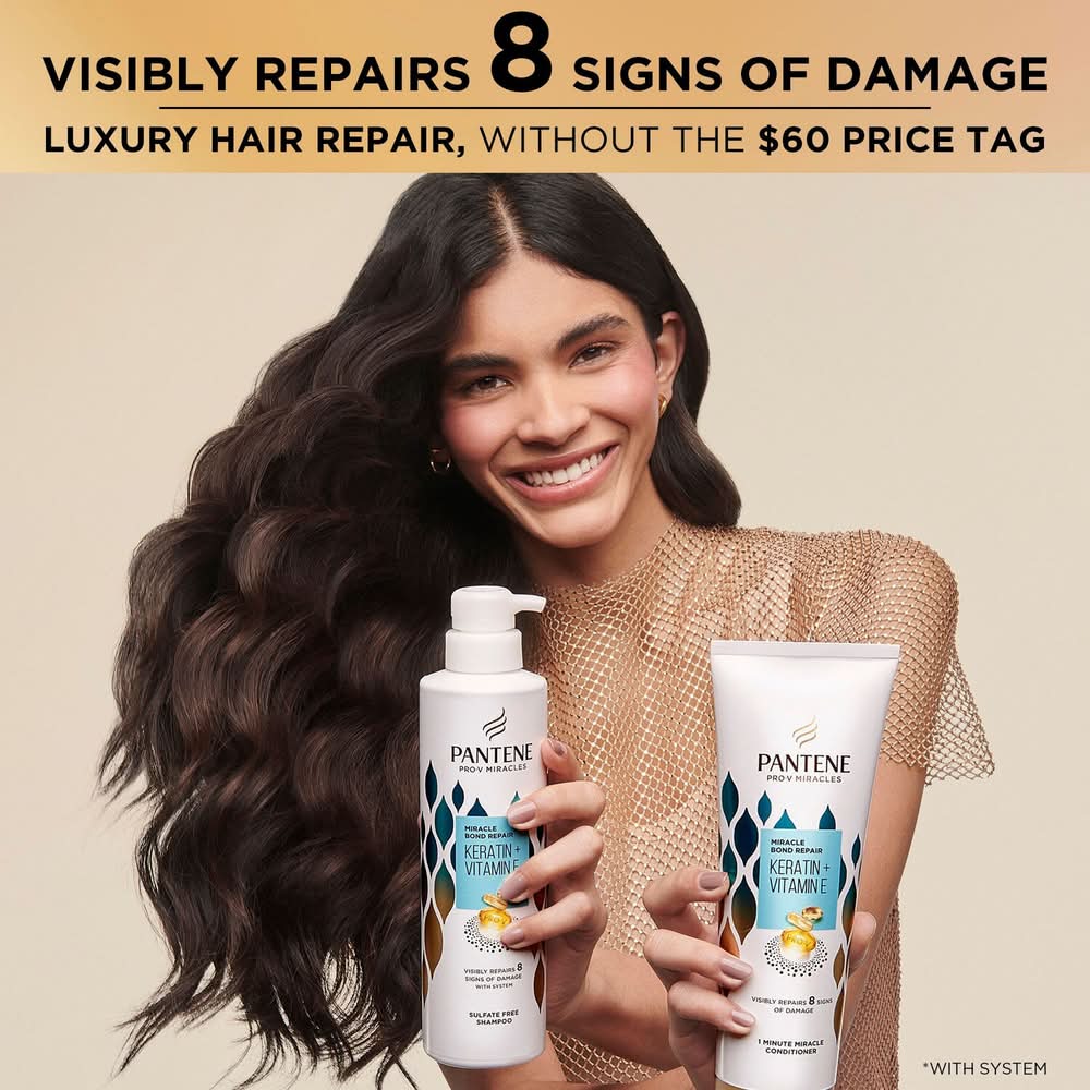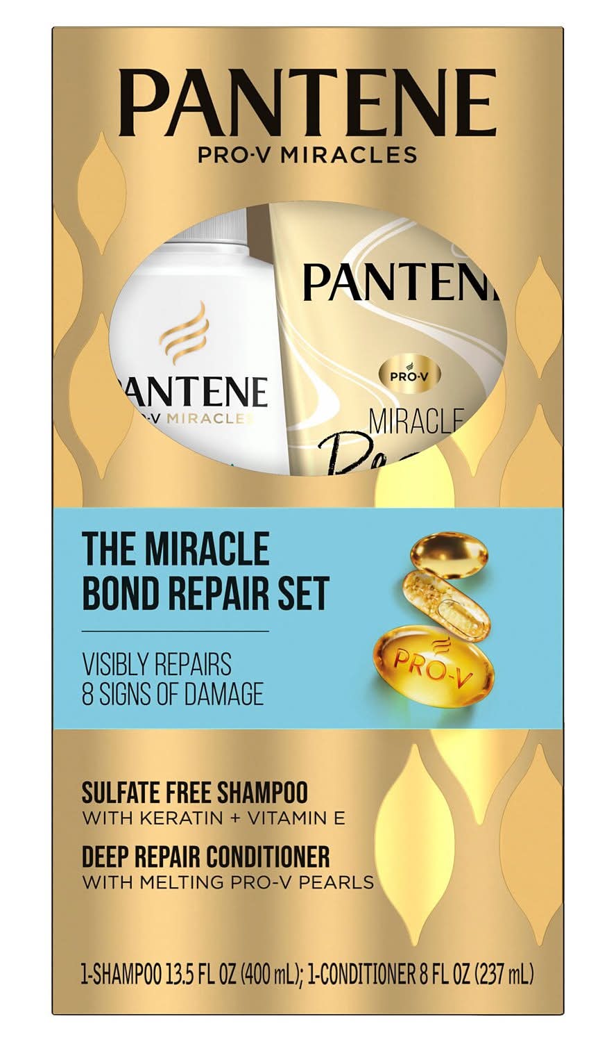 BOND REPAIR FOR YOUR HAIRVisibly repair 8 signs of damage - frizz, dullness, roughness, breakage, tangles, flyaways, split-ends and dryness, to restore softness and vibrancy. Pantene Pro-V Miracles Miracle Bond Repair Sulfate-Free Shampoo, made with Keratin and multi-vitamin complex, gently cleanses without drying. It's even safe for color-treated hair while building bonds for softer, more vibrant hair.RESCUE YOUR STRANDSVisibly Repair 6 months of damage in just 1 use with Pantene Miracle Rescue Deep Repair Conditioner with Melting Pro-V Pearls. Transform your hair with the nutrient-rich formula to soften and repair from the inside for smooth, radiant hair.HOW TO USEMassage Pantene Pro-V Miracle Bond Repair Sulfate-Free Shampoo all over your wet hair, massage and rinse. After shampooing, apply Pantene Miracle Rescue Deep Repair Conditioner with Melting Pro-V Pearls. Rub product in your palm, then massage into wet hair from mid-lengths to ends to instantly dissolve pro-v pearls. Leave on for 1-3 minutes and rinse. Pair with Pantene 10 in 1 Multi-Tasking Leave-In Spray for best results. BOND BUILDINGTo repair 8 signs of damageMelting Pro-V Pearls Melts away damage from the inside for shiny, healthy hair VISIBLY REPAIRSTo strengthen weak and damaged hairMelting Pro-V Pearls dissolve into hair for an instant boost of nourishment POWERFUL INGREDIENTSGently cleanse with the power of Pro-vitamin B5, Keratin, and Vitamin ENourish with the power of Pro-Vitamin Melting Pearls EASY TO USESimply apply in the shower, massage and rinseUse Conditioner daily for best results