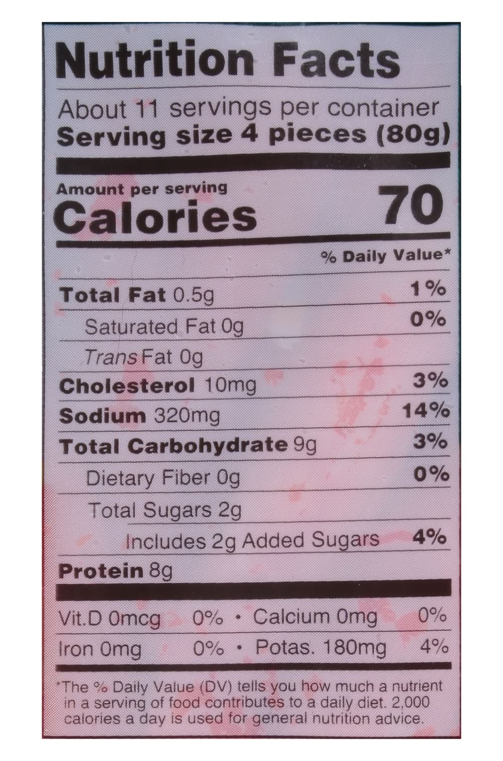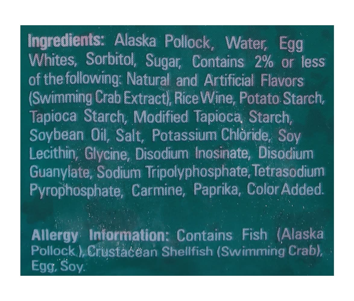 Ingredients: Alaska Pollock, Water, Egg Whites, Sorbitol, Sugar, Contains 2% or Less of the Following: Natural and Artificial Flavors (Swimming Crab Extract), Rice Wine, Potato Starch, Tapioca Starch, Modified Tapioca Starch, Soybean Oil, Salt, Potassium Chloride, Soy Lecithin, Glycine, Disodium Inosinate, Disodium Guanylate, Sodium Tripolyphosphate, Tetrasodium Pyrophosphate, Carmine, Paprika, Color Added Contains: Fish, Fish, Pollock, Crustacean Shellfish, Crustacean Shellfish, Crab, Eggs, Soybeans
