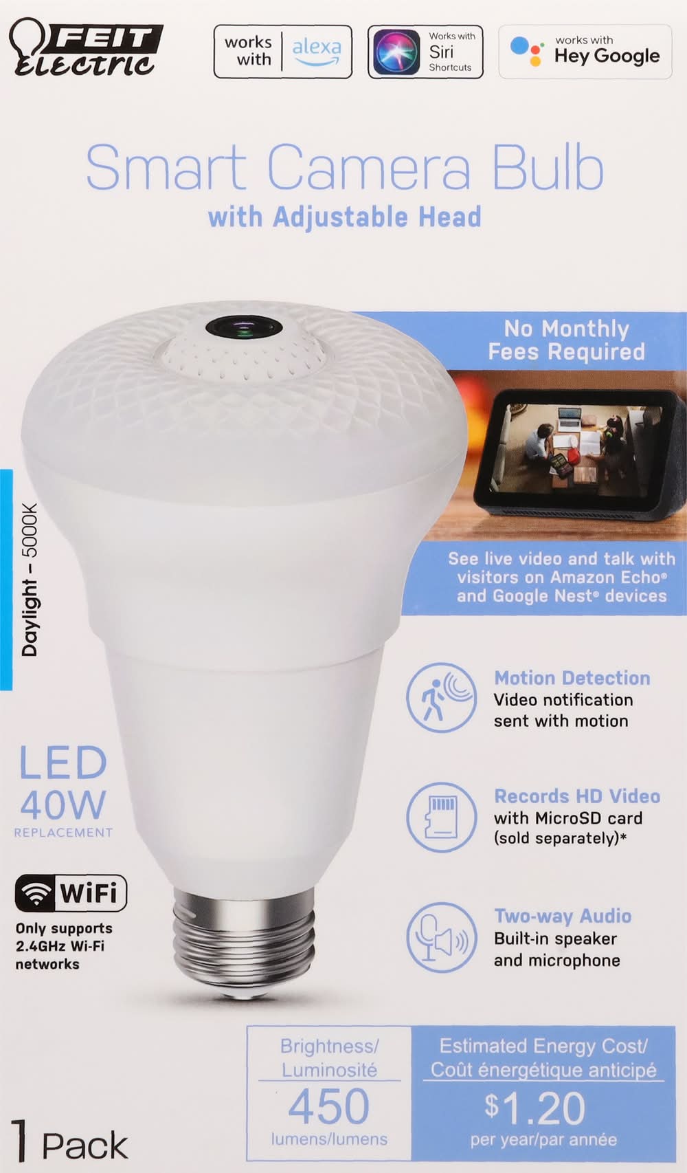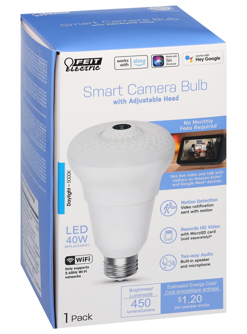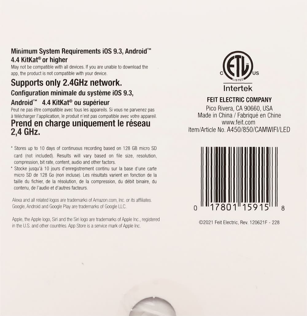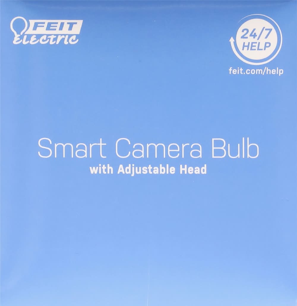Works with Alexa. Works with Siri shortcuts. Works with Hey Google. Smart camera bulb with adjustable head. No monthly fees required. See live video and talk with visitors on Amazon Echo and Google Next devices. Motion detection: Video notification sent with motion. Records HD video with MicroSD card (sold separately) (stores up to 10 days of continuous recording based on 128 GB micro SD card (not included). Results will vary based on full size, resolution, compression, bit rate, content, audio and other factors). Two-way audio: Built-in speaker and microphone. Daylight - 5000K. LED 40W replacement. WiFi: Only supports 2.4GHz Wi-Fi networks. Brightness: 450 lumens. Estimated energy cost: $.1.20 per year. Get a clear view of your home. HD: 1080p HD video. Take pictures right from app. Motion detection. Notification. 32-foot night vision. Two-way audio. 330 degrees adjustable head. Works with Feit Electric App. Minimum system requirements iOS 9.3, Android 4.4 KitKat of higher. May not be applicable with all devices. If you are unable to download the app, the product is not compatible with your device. Supports only 2.4GHz network. Limited warranty: This product is warrantied to be free from defects in workmanship and materials for up to 1 year from date of purchase. If the product fails within the warranty period, please visit feit.com/help for instructions on replacement/refund or call 866.326.BULB. Replacement or refund is your sole remedy. Except to the extent prohibited by applicable law, any implied warranties are limited in duration to the duration of this warranty. Liability for incidental or consequential damages is hereby expressly excluded. Some states and provinces do not allow the exclusion of incidental or consequential damages, so the above limitation or exclusion may not apply to you. This warranty gives you specific legal rights, and you may also have other rights which vary from state to state or province to province. ETL listed. www.feit.com. Work with Feit Electric App. Download on the App Store. Get it on Google Play. For more information please visit www.feit.com. For 24/7 customer support, visit feit.com/help. Made in China.