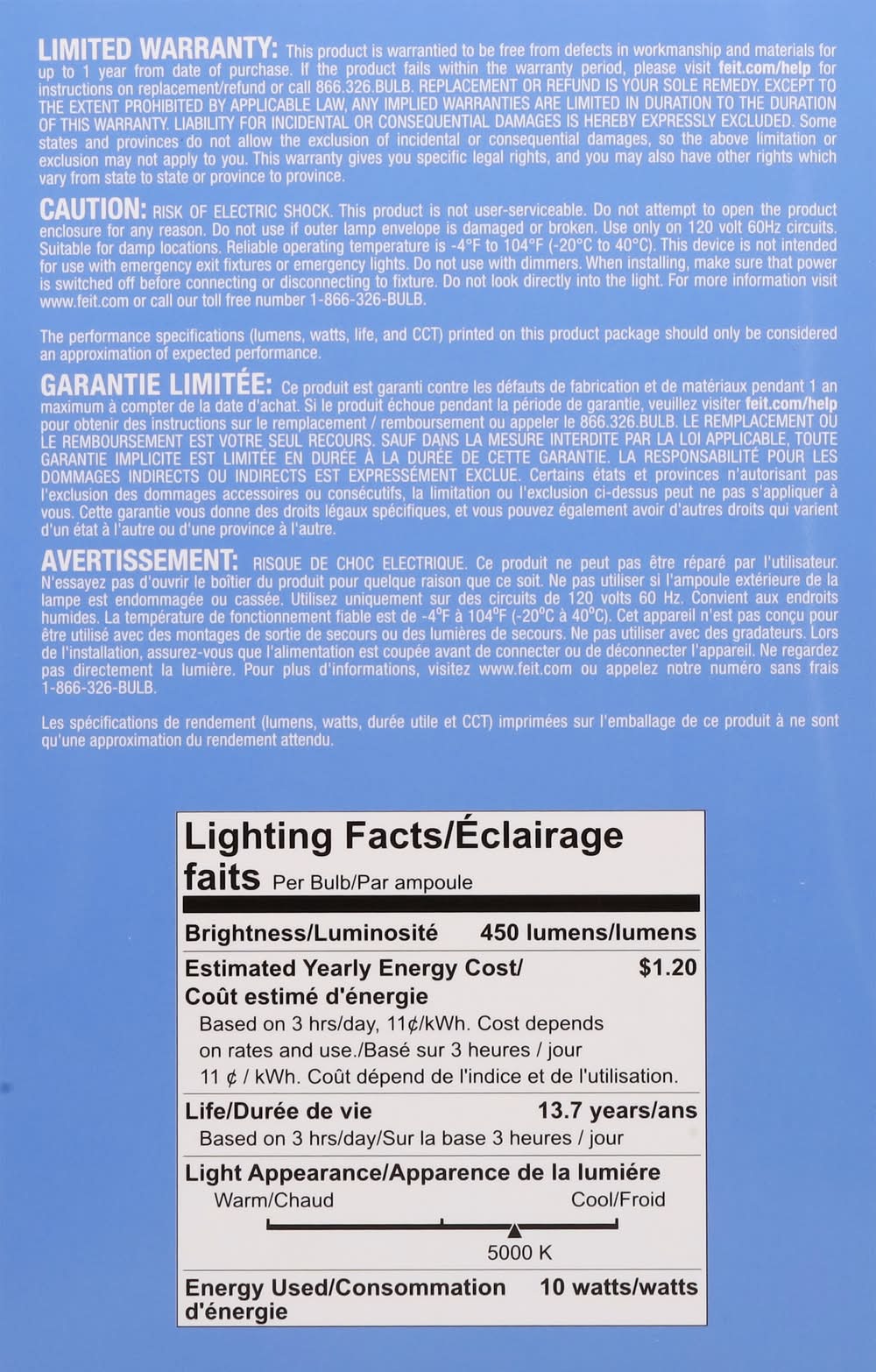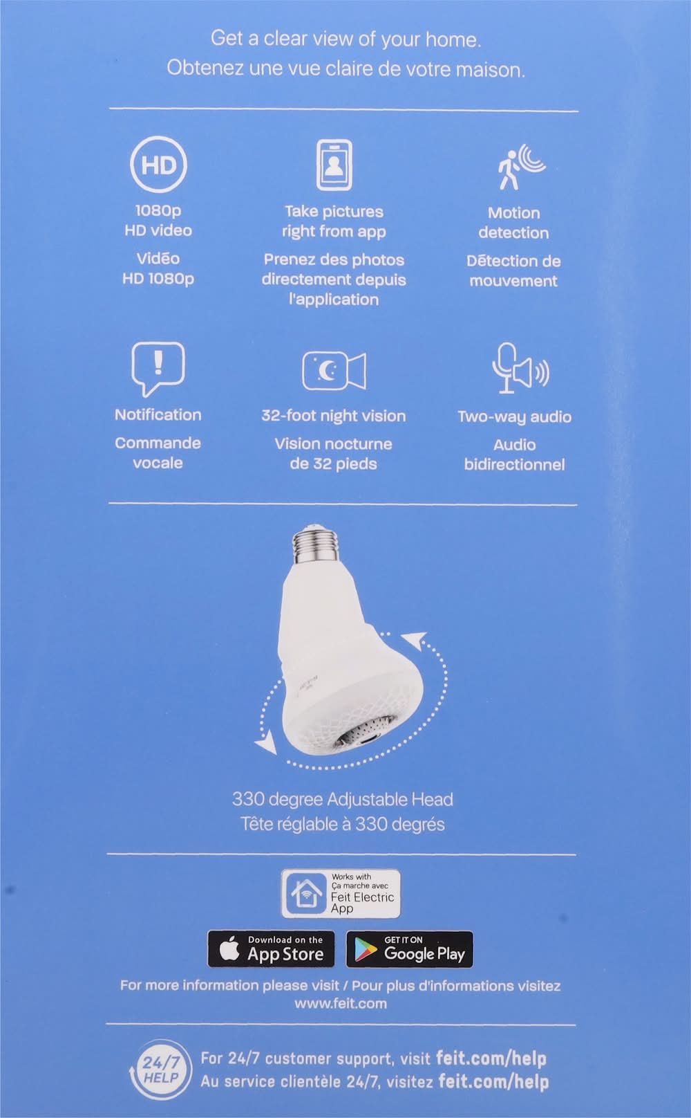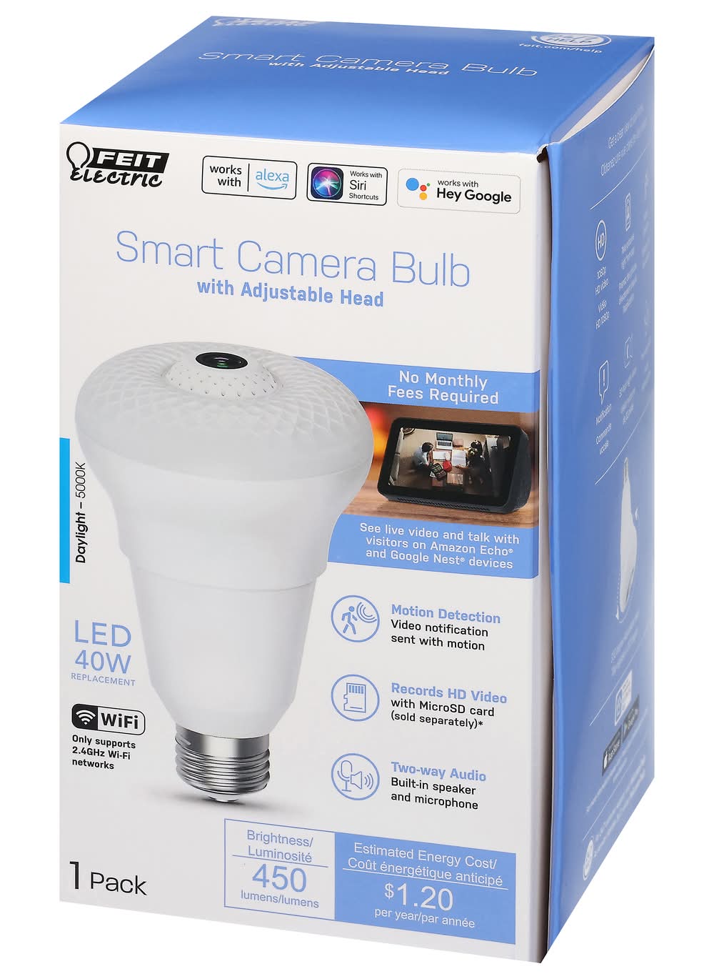 Works with Alexa. Works with Siri shortcuts. Works with Hey Google. Smart camera bulb with adjustable head. No monthly fees required. See live video and talk with visitors on Amazon Echo and Google Next devices. Motion detection: Video notification sent with motion. Records HD video with MicroSD card (sold separately) (stores up to 10 days of continuous recording based on 128 GB micro SD card (not included). Results will vary based on full size, resolution, compression, bit rate, content, audio and other factors). Two-way audio: Built-in speaker and microphone. Daylight - 5000K. LED 40W replacement. WiFi: Only supports 2.4GHz Wi-Fi networks. Brightness: 450 lumens. Estimated energy cost: $.1.20 per year. Get a clear view of your home. HD: 1080p HD video. Take pictures right from app. Motion detection. Notification. 32-foot night vision. Two-way audio. 330 degrees adjustable head. Works with Feit Electric App. Minimum system requirements iOS 9.3, Android 4.4 KitKat of higher. May not be applicable with all devices. If you are unable to download the app, the product is not compatible with your device. Supports only 2.4GHz network. Limited warranty: This product is warrantied to be free from defects in workmanship and materials for up to 1 year from date of purchase. If the product fails within the warranty period, please visit feit.com/help for instructions on replacement/refund or call 866.326.BULB. Replacement or refund is your sole remedy. Except to the extent prohibited by applicable law, any implied warranties are limited in duration to the duration of this warranty. Liability for incidental or consequential damages is hereby expressly excluded. Some states and provinces do not allow the exclusion of incidental or consequential damages, so the above limitation or exclusion may not apply to you. This warranty gives you specific legal rights, and you may also have other rights which vary from state to state or province to province. ETL listed. www.feit.com. Work with Feit Electric App. Download on the App Store. Get it on Google Play. For more information please visit www.feit.com. For 24/7 customer support, visit feit.com/help. Made in China.