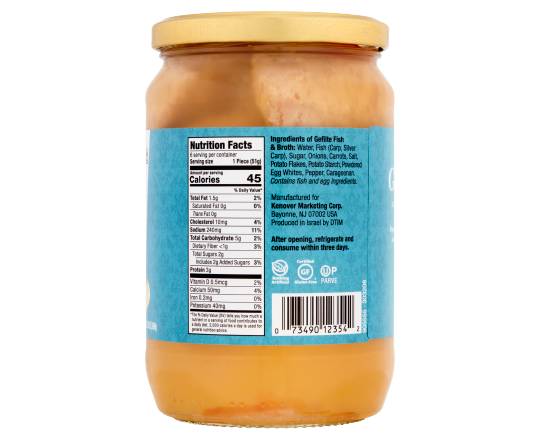 Water, Fish (Carp, Silver Carp), Sugar, Onions, Carrots, Salt, Potato Flakes, Potato Starch, Powdered Egg Whites, Pepper, Carageenan Contains: Eggs, Fish