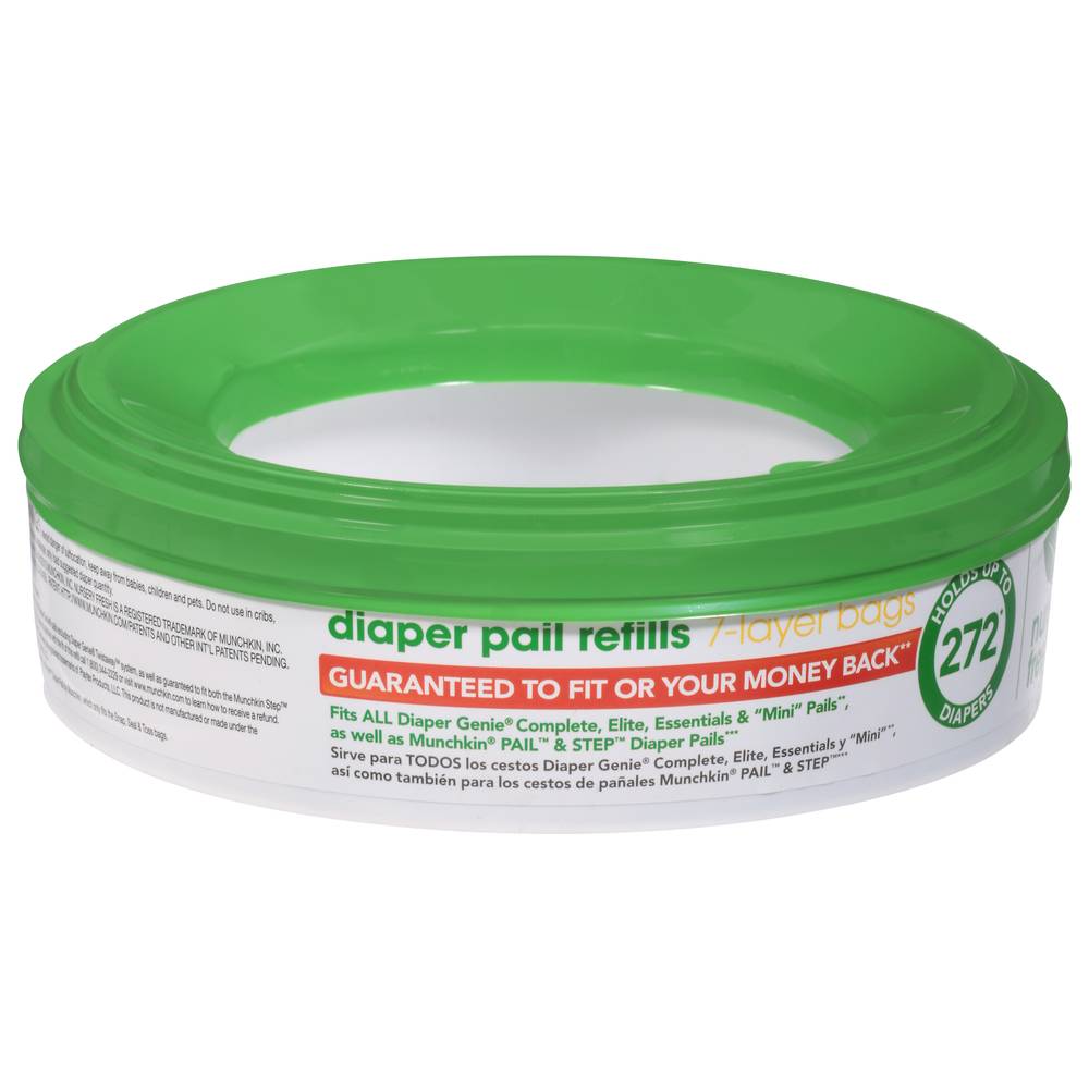 Holds up to 272 (based on newborn sized diapers) diapers. Fits all Diaper Genie Complete, Elite, Essential & Mini Pails (This refill is guaranteed to fit all Diaper Genie pails excluding Diaper Genie Twistaway system, as well as guaranteed to fit both the Munchkin Step and Pail diaper pails. If you are not satisfied with the refill call 1 (800) 344-2229 or visit www.munchkin.com to learn how to received a refund), as well as Munchkin Pail & Step Diaper Pails (Does not fit the original Arm & Hammer Diaper Pail by Munchkin, which only fits the snap, seal & toss bags). Guaranteed to fit or your money back (This refill is guaranteed to fit all Diaper Genie pails excluding Diaper Genie Twistaway system, as well as guaranteed to fit both the Munchkin Step and Pail diaper pails. If you are not satisfied with the refill call 1 (800) 344-2229 or visit www.munchkin.com to learn how to received a refund). www.munchkin.com. Munchkin, Inc., 7835 Gloria Ave., Van Nuys, CA, 91406