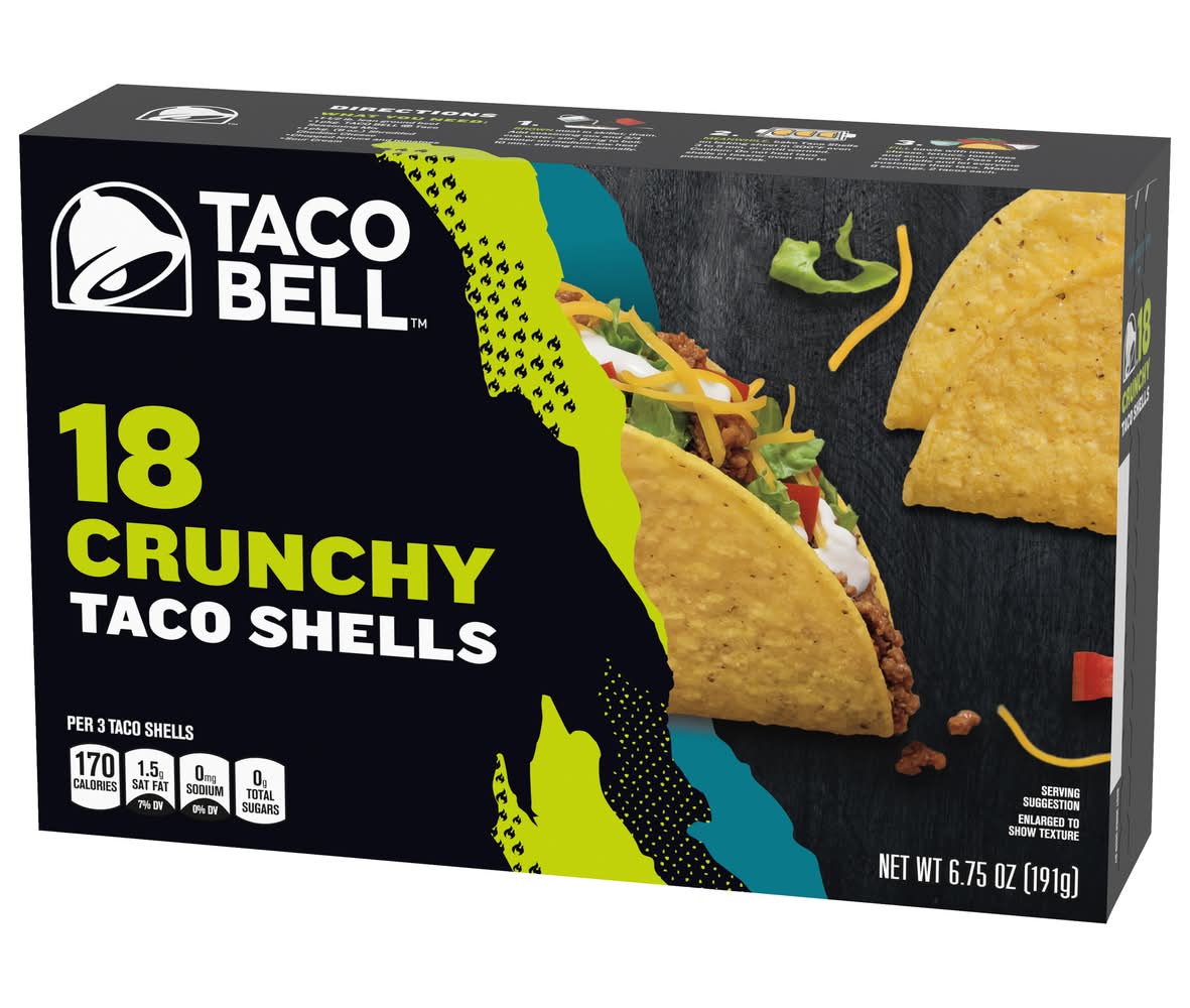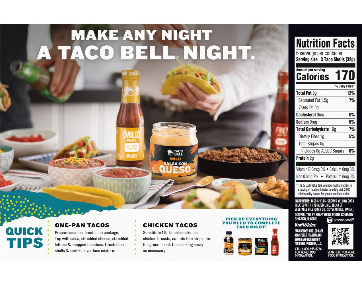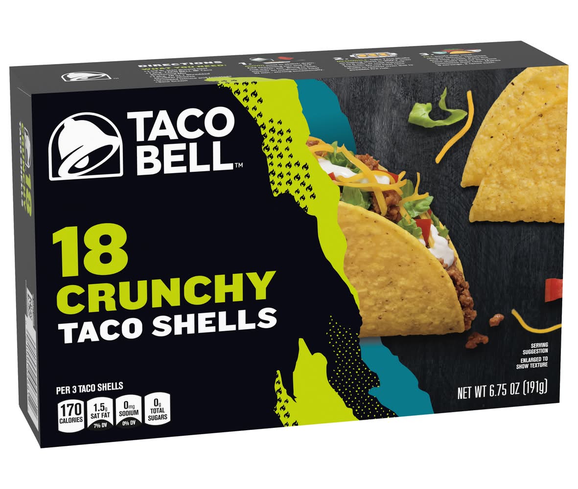 Live más at home with our Taco Bell Crunchy Taco Shells. Taco Bell makes mealtime more craveable with our crunchy taco shells made with yellow corn flour. Add your favorite protein cooked with Taco Bell's signature seasonings to our shells, then customize your taco with your favorite toppings like lettuce, tomato, cheese, sour cream and salsa. To prepare, place taco shells on a baking sheet and bake at 300°F for 3-5 minutes or until warmed. You can also crush the taco shells and sprinkle them over your favorite Mexican dish. Each 6.75-ounce box contains 18 taco shells. Live more fervently, more authentically, more joyfully with Taco Bell. Kraft Heinz Foods Company., Chicago, IL, 60601